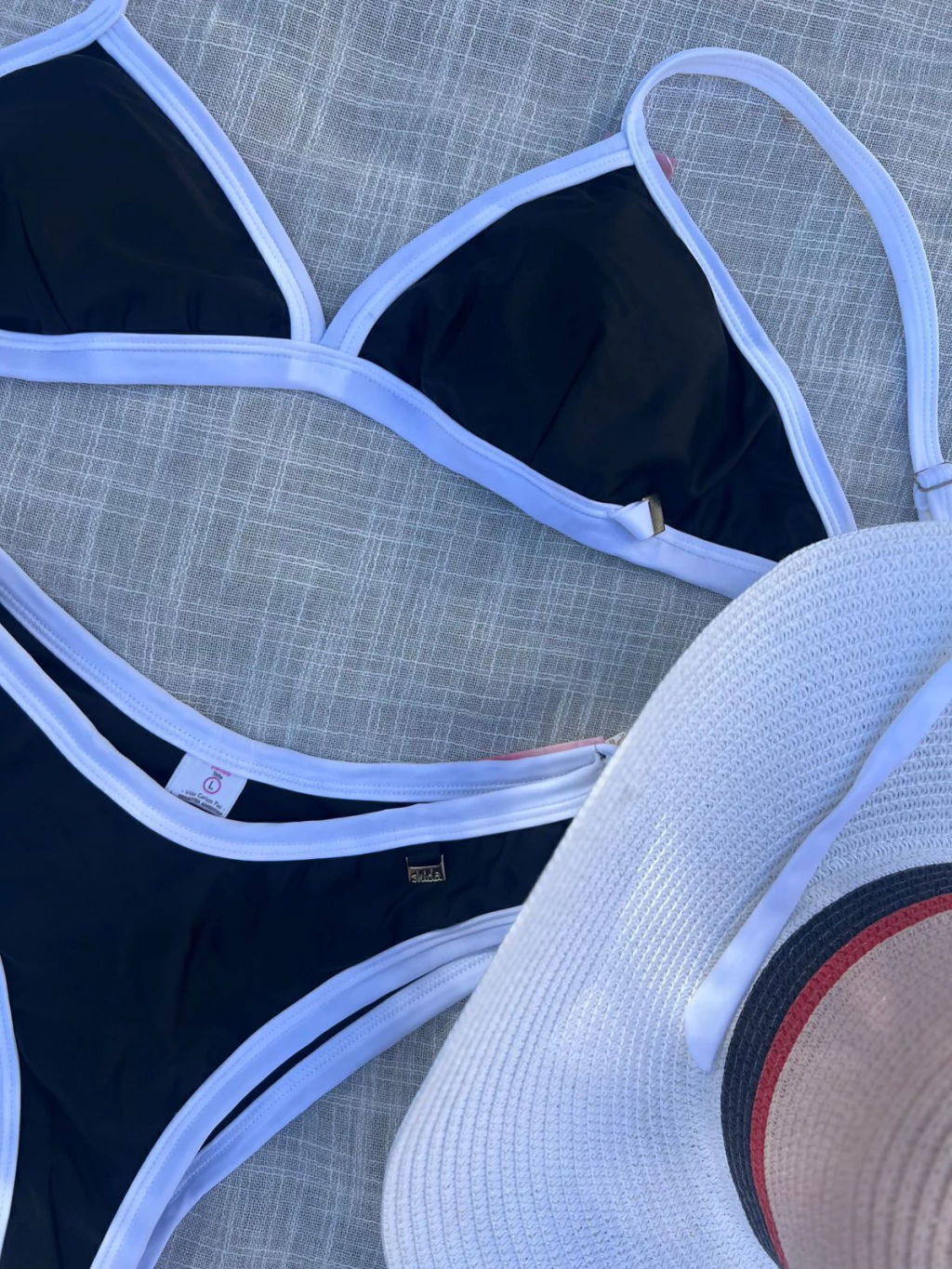 Conjunto bikini en color blanco y negro. Corpiño triángulo, tiras regulables y tazas removibles; bombacha vedetina.