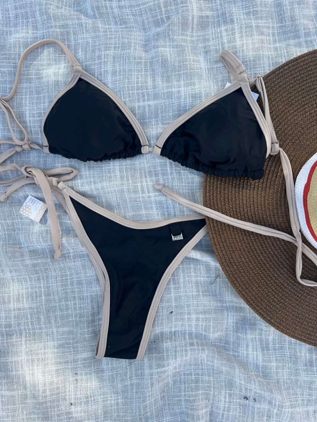 Conjunto bikini en color negro y beige. Corpiño, tiras regulables y tazas removibles; bombacha cola less.