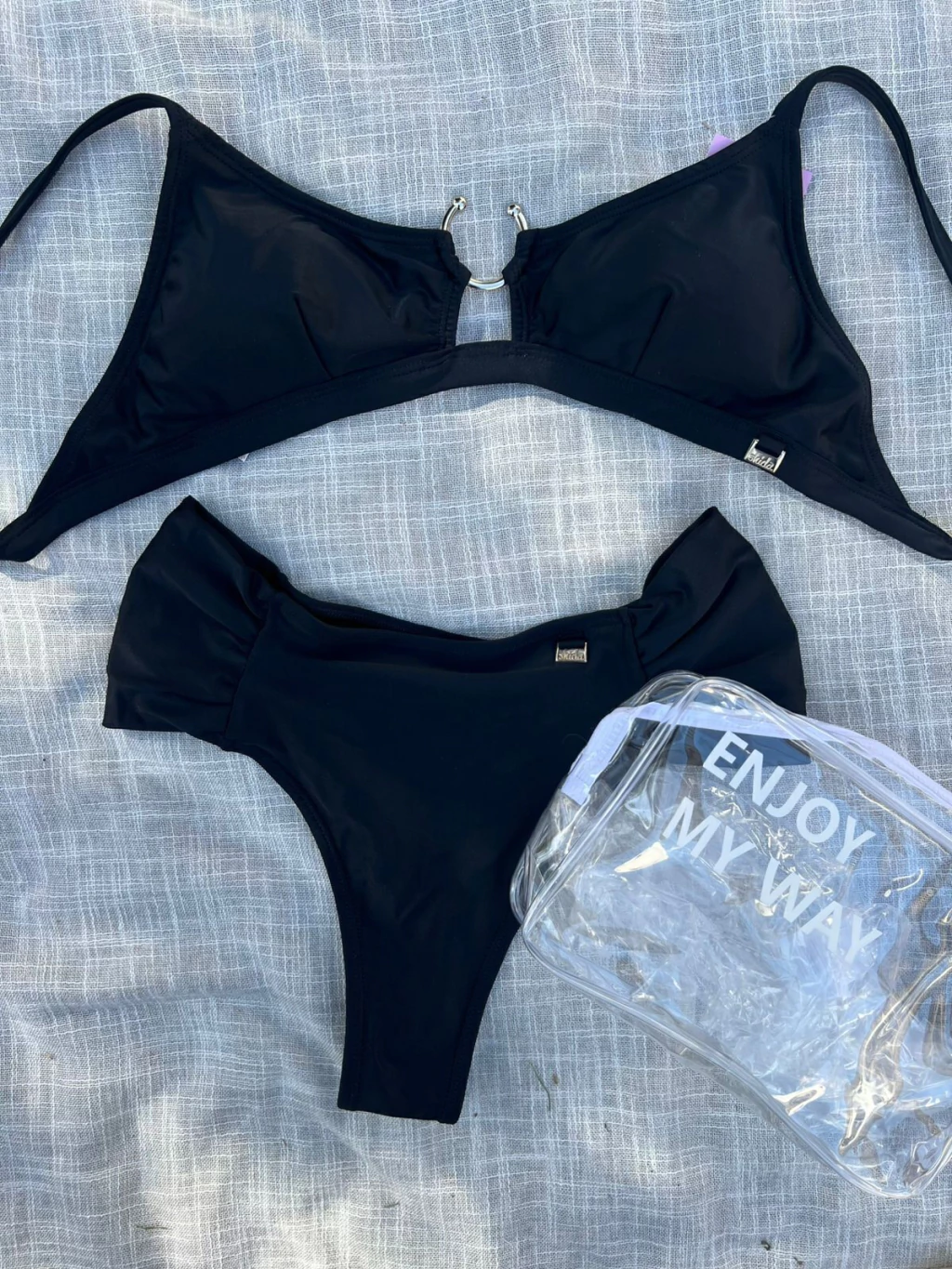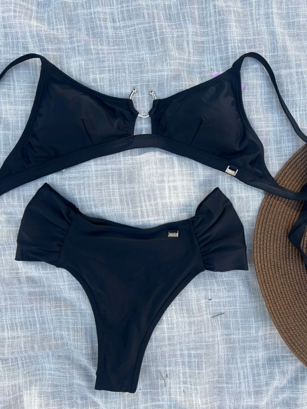 Conjunto bikini en color negro. Corpiño con argolla semi circular en el medio, tiras regulables y tazas removibles; bombacha cola less.