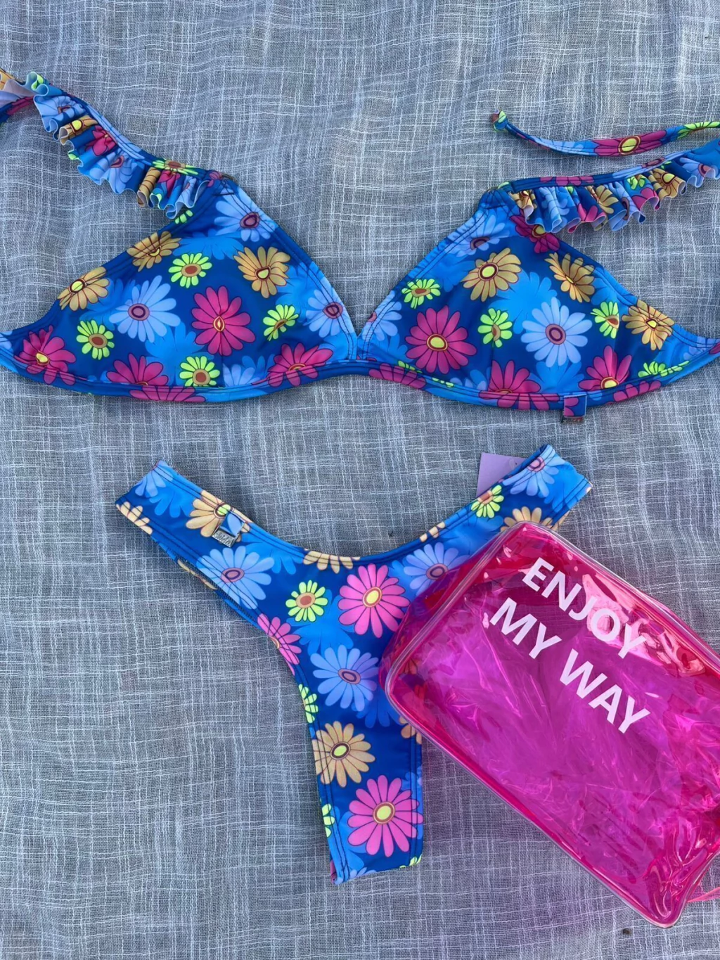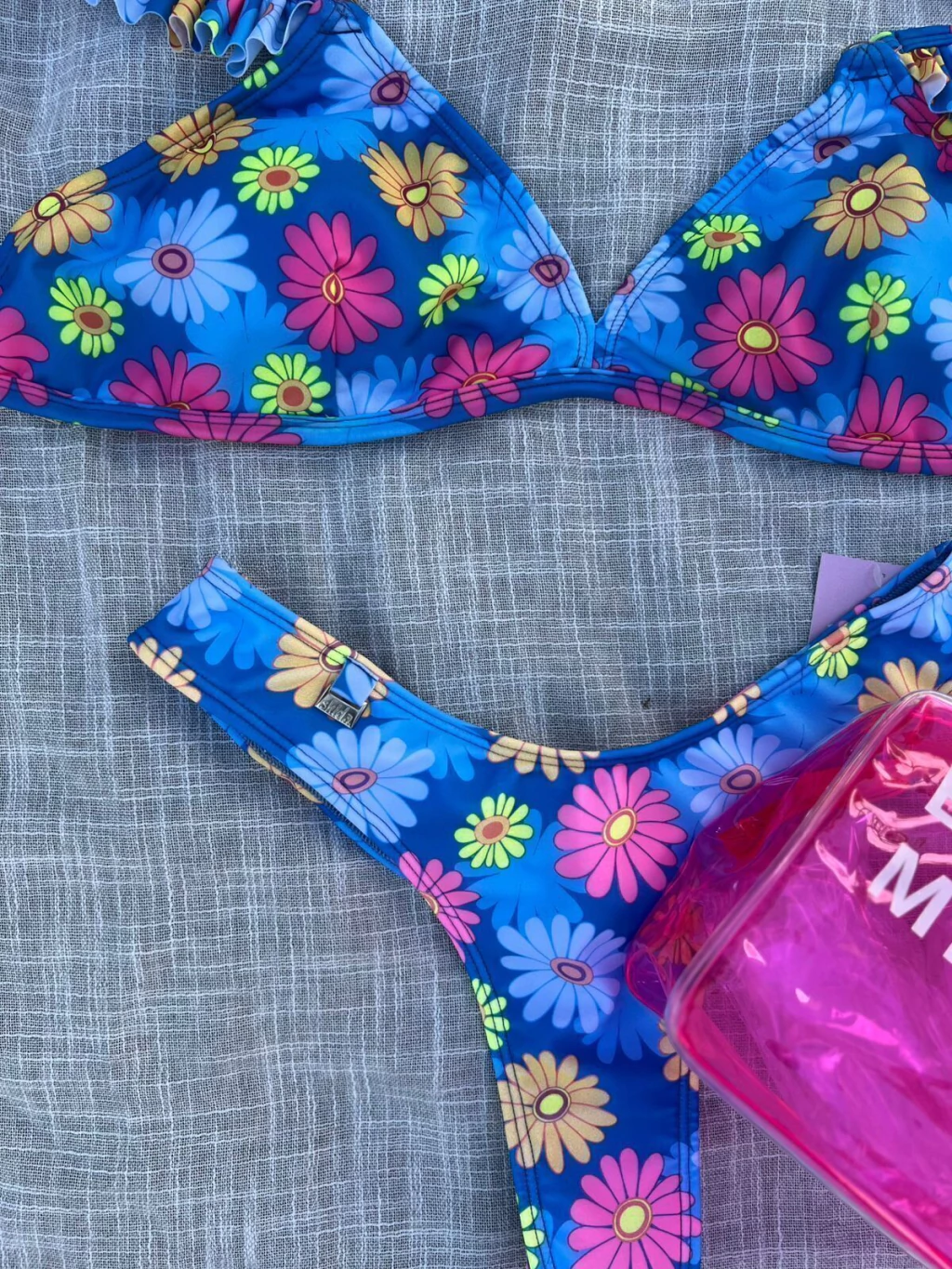 Conjunto bikini con estampado floral. Tiras regulables del corpiño y tazas removibles; bombacha tiro alto cola less.