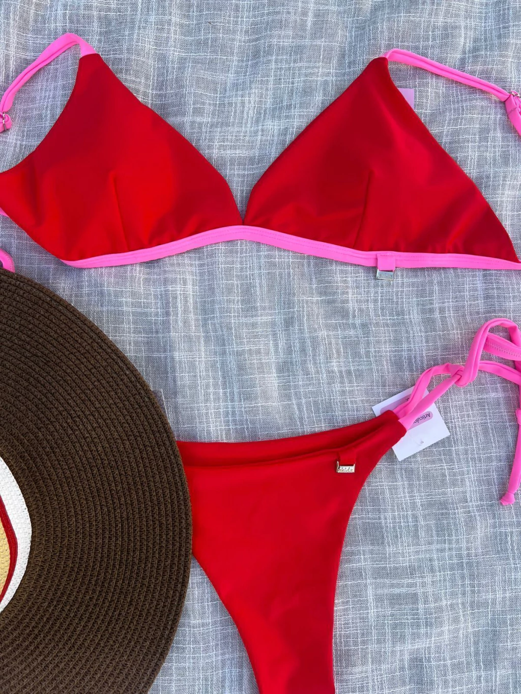 Conjunto bikini en color rojo y rosa chicle. Tiras regulables del corpiño y tazas removibles; bombacha cola less con tiras a los costados para regular y atar.