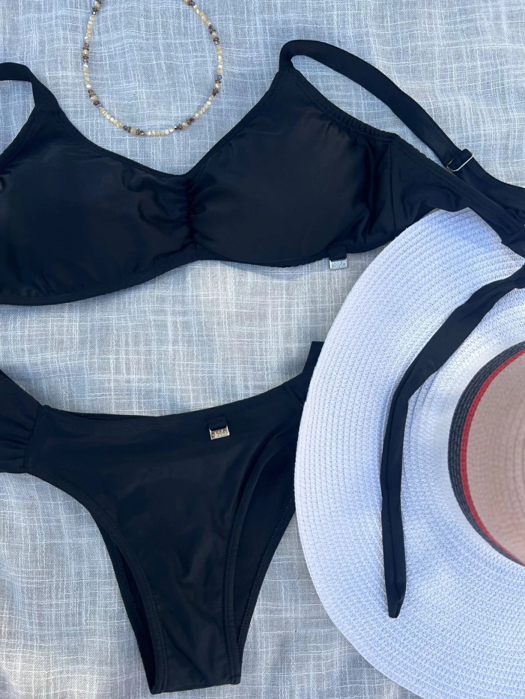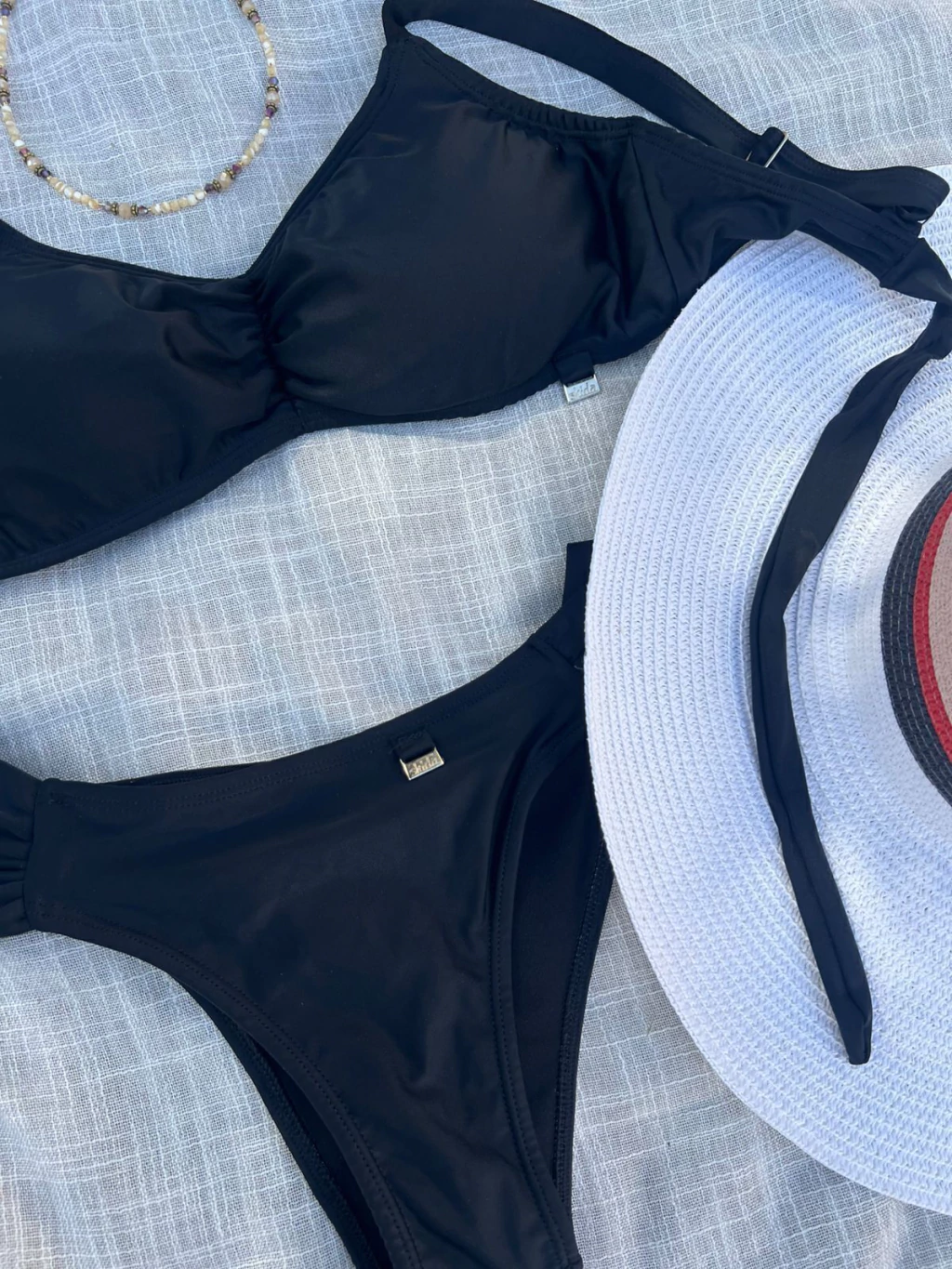 Conjunto bikini en color negro. Corpiño, tiras regulables y tazas removibles; bombacha vedetina.