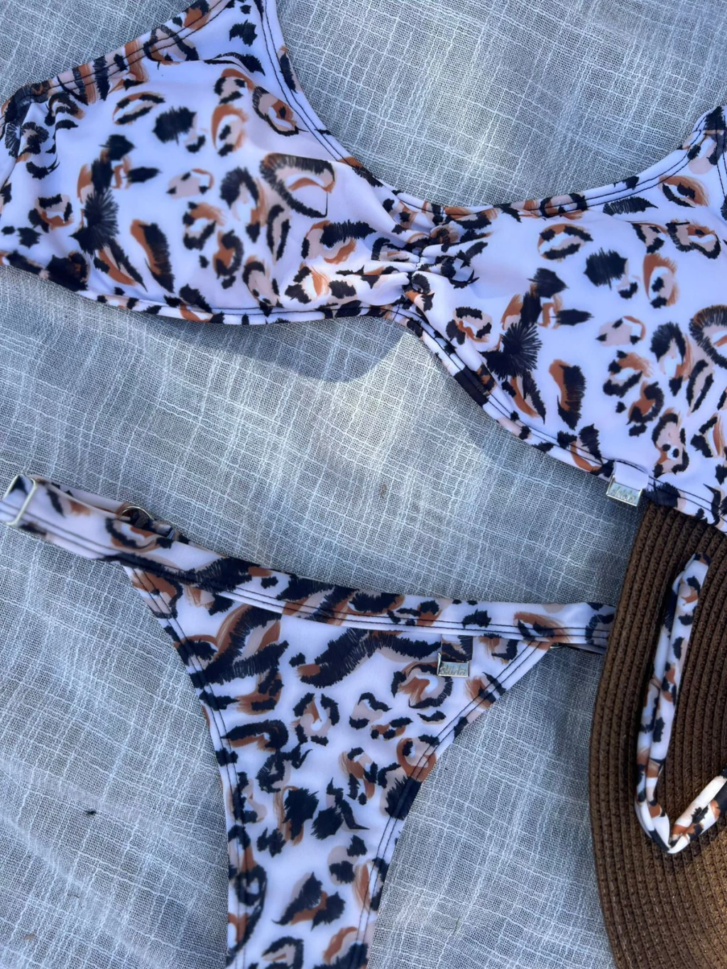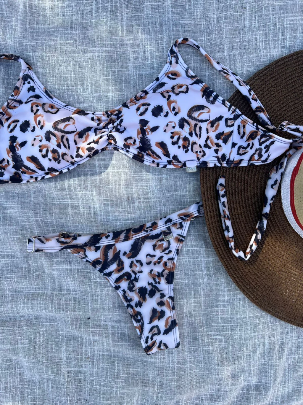 Conjunto bikini animal print. Corpiño triangulo, tiras regulables y tazas removibles; bombacha cola less.