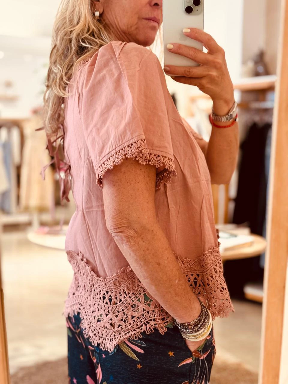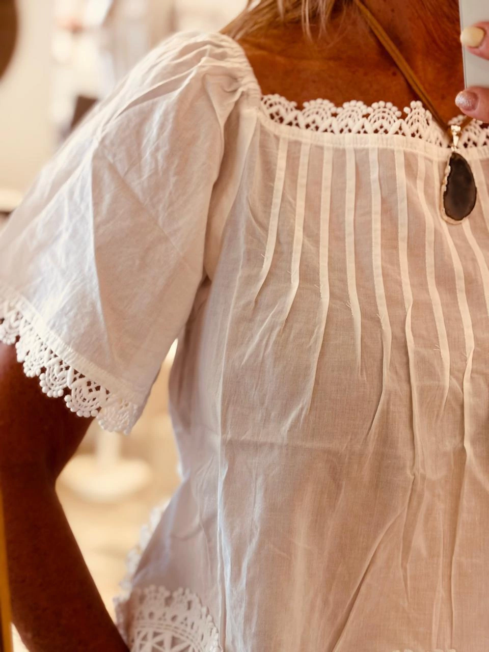 Blusa manga corta con elástico ariba. Detalles de broderie y crochet.