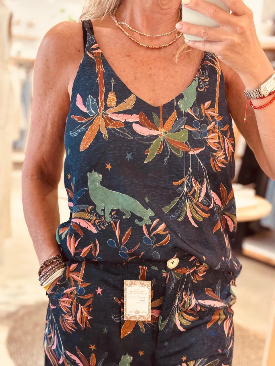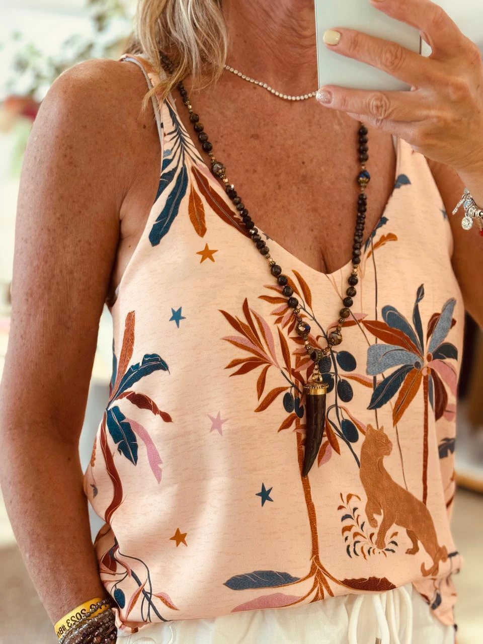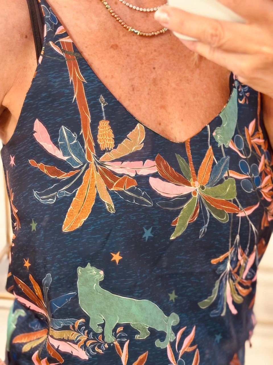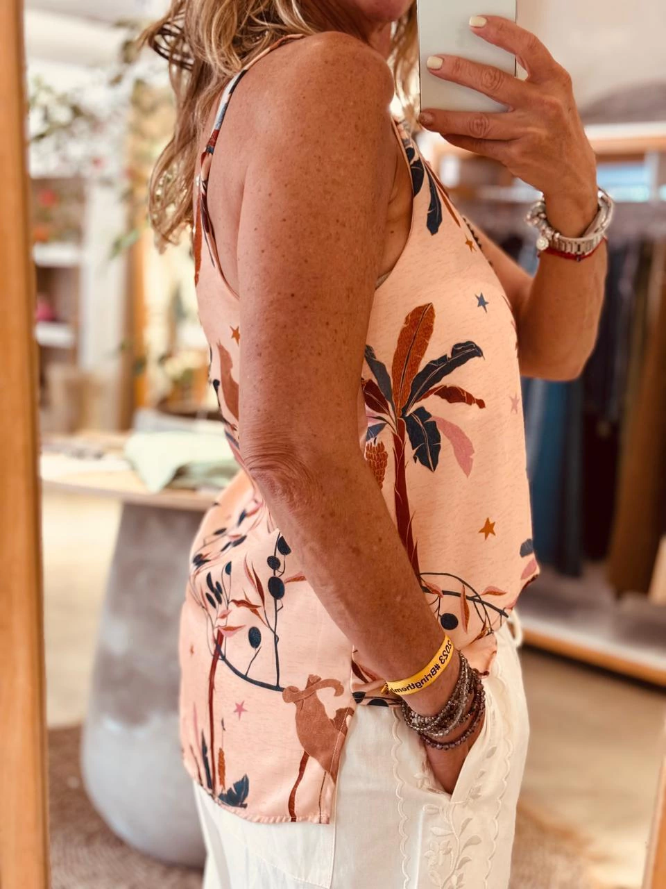 Blusa musculosa de seda con estampa de tigres y palmeras en diferentes colores.