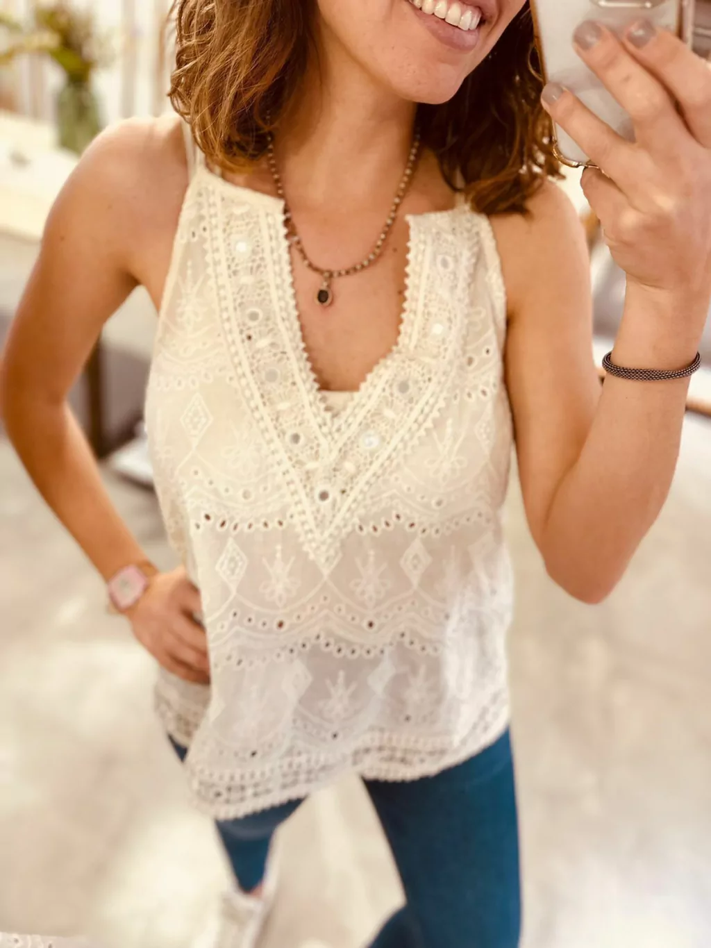Blusa musculosa con tela broderie escote en V tiritas hombros escote con detalle broderie dorado