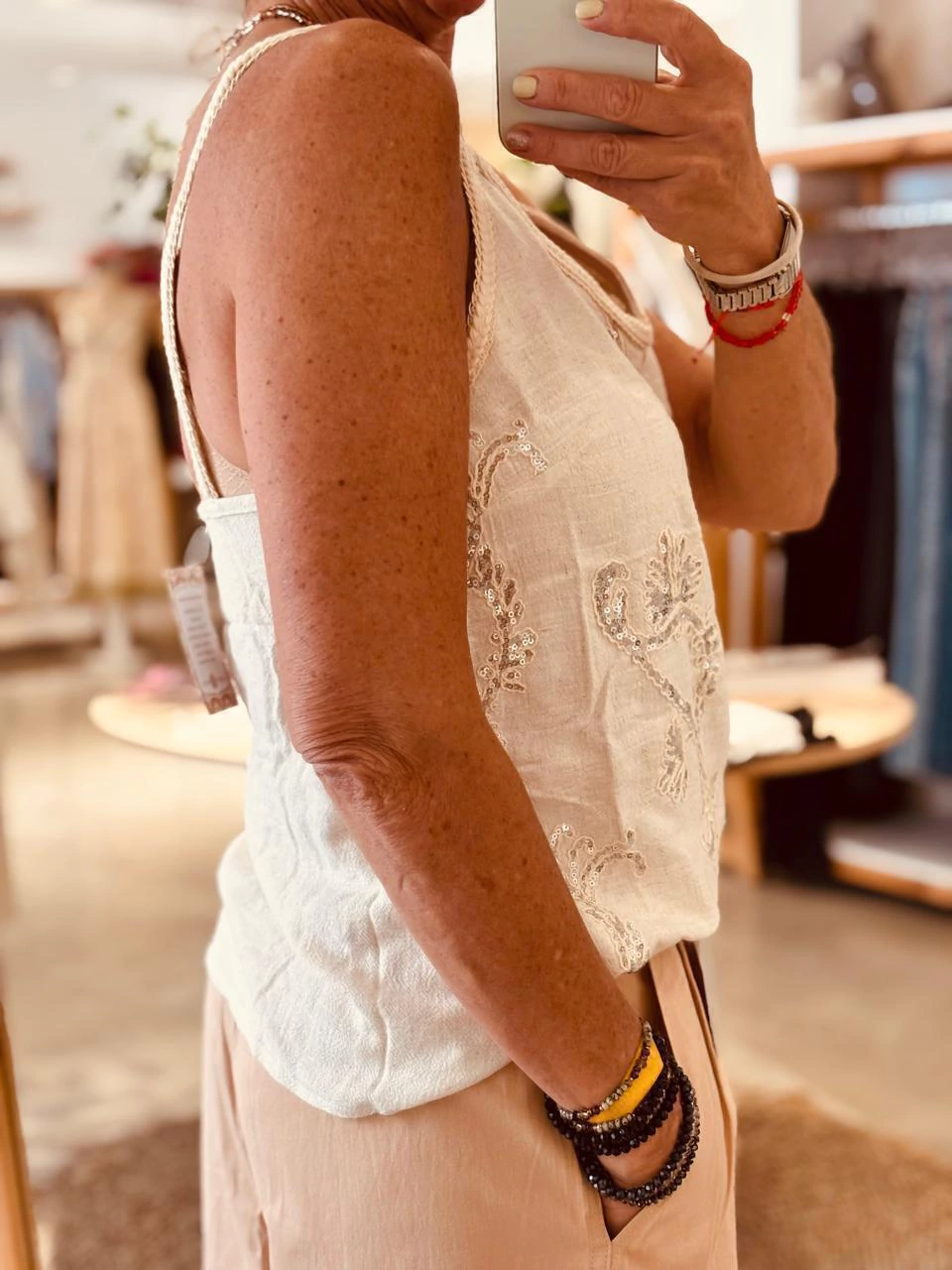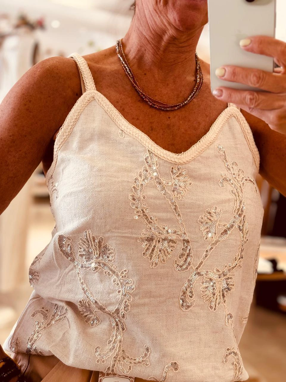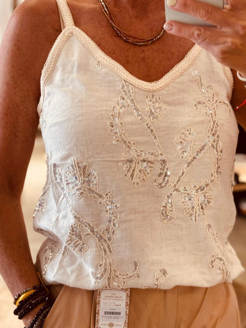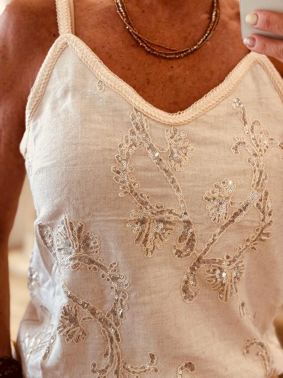 Blusa musculosa, textil lino en color natural. Bordado en lentejuelas plateadas.