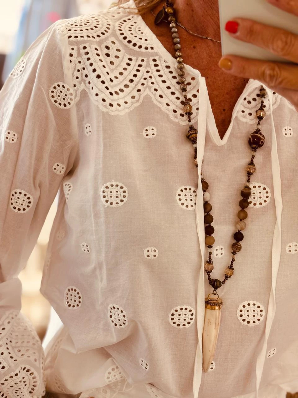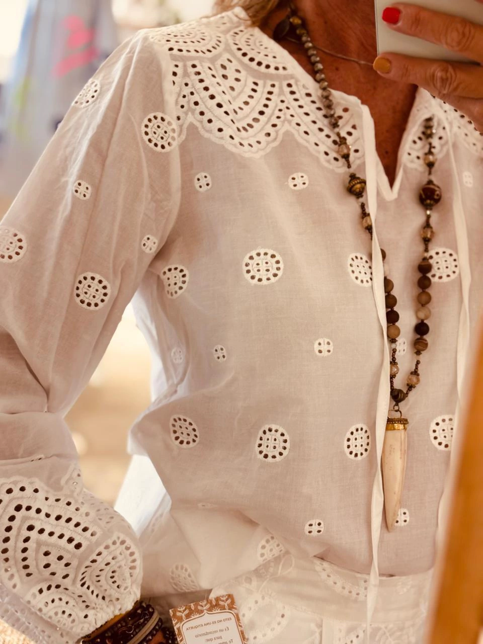Blusa calada con elástico en mangas y tiritas para atar en la parte del escote.