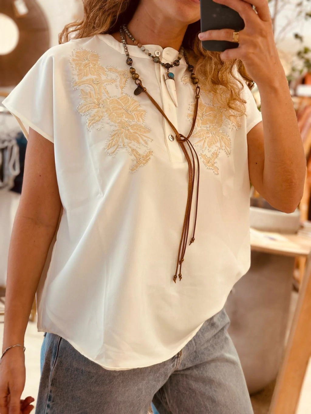 Blusa con bootones en el centro, flores bordadas a hilo y mostacillas .