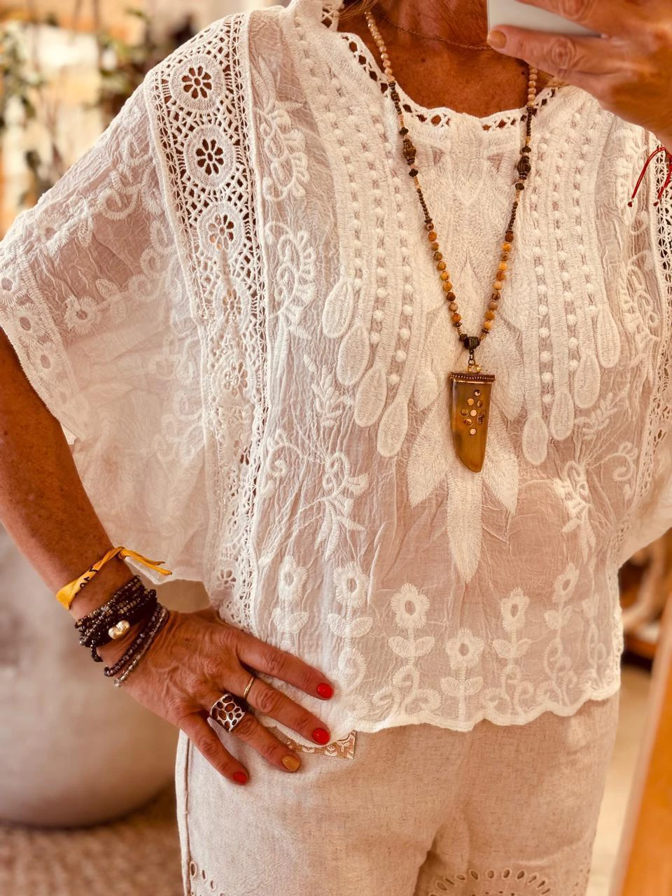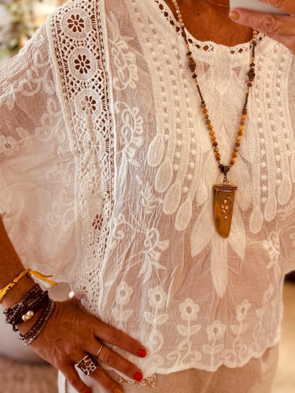 Blusa blanca manga caída, completamente bordada y detalles en crochet.