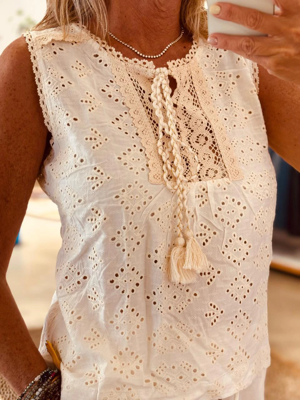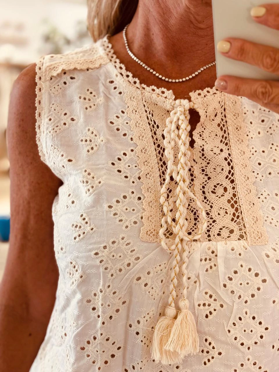 Blusa broderie en color crudo. Detalles de puntilla a tono en el cuello y las mangas, escote con tejido crochet y soguita para atar.