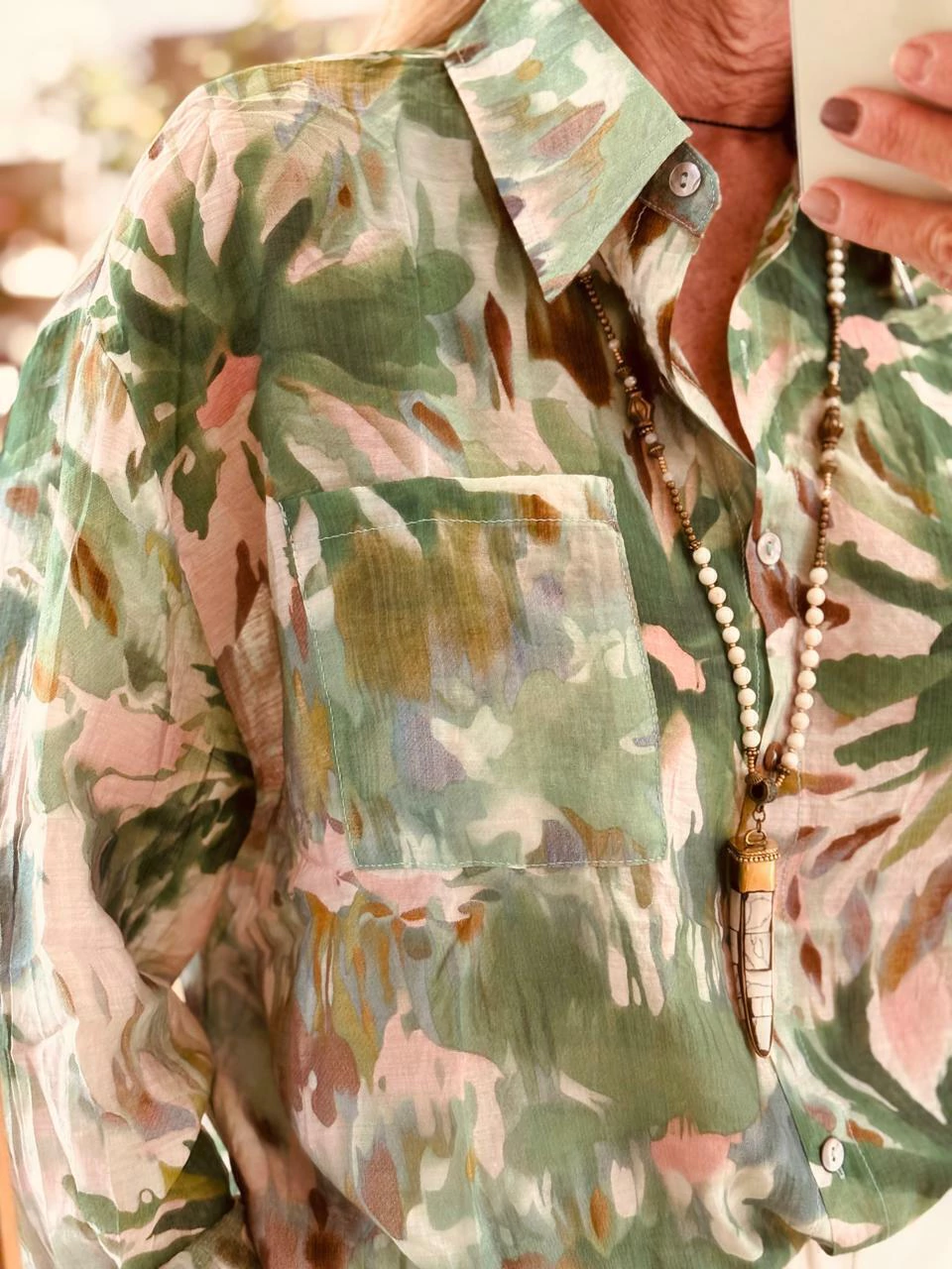 Camisa con diseño de flores pintadas en acuarela. Tela gasa finita.