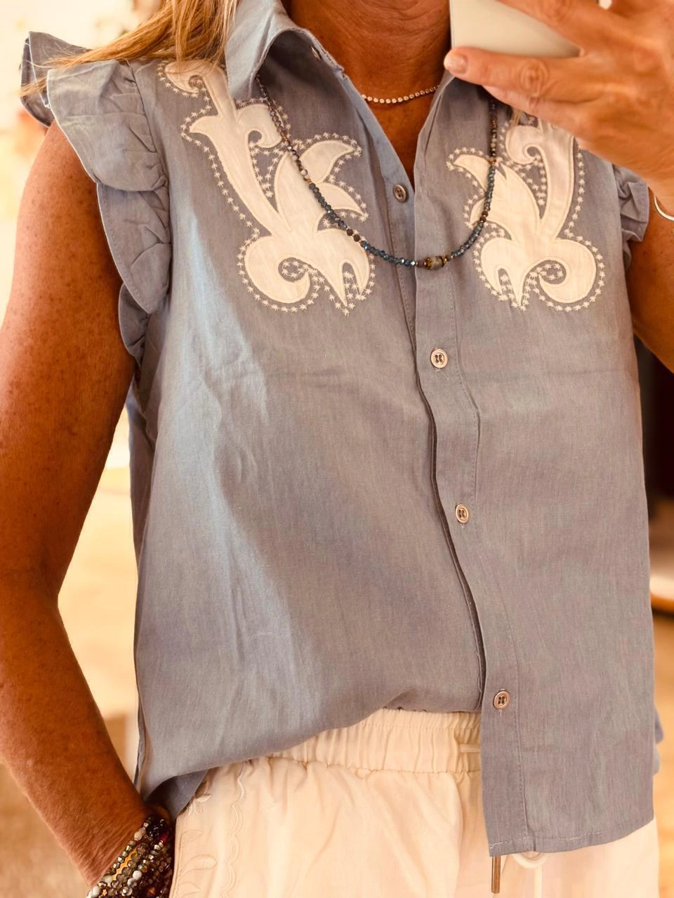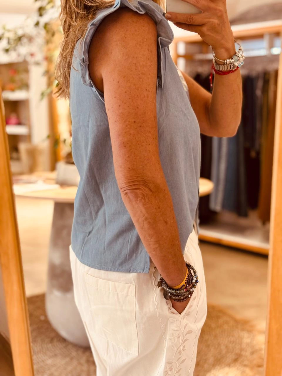 Camisa de jean celeste, musculosa con volados en las mangas. Aplique de tela en color blanco al frente y bordado a tono.