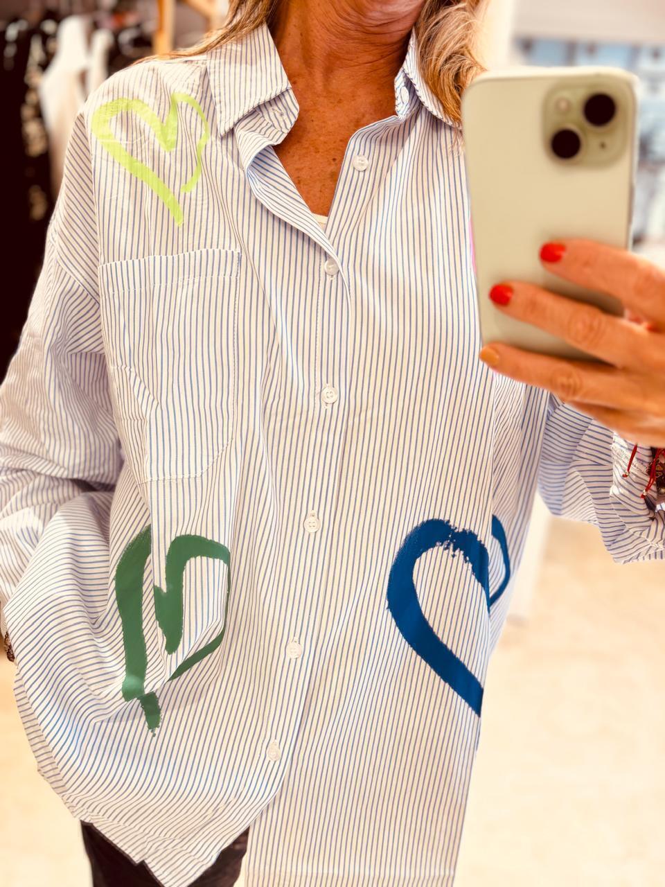 Camisa amplia rayada en color celeste y blanco, con corazones de colores.