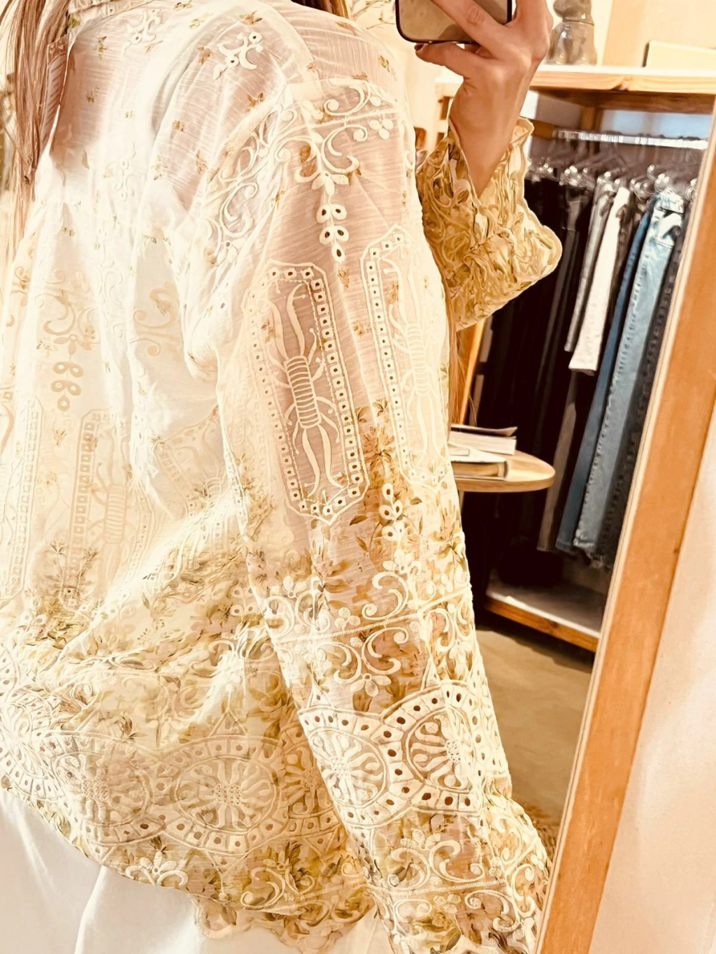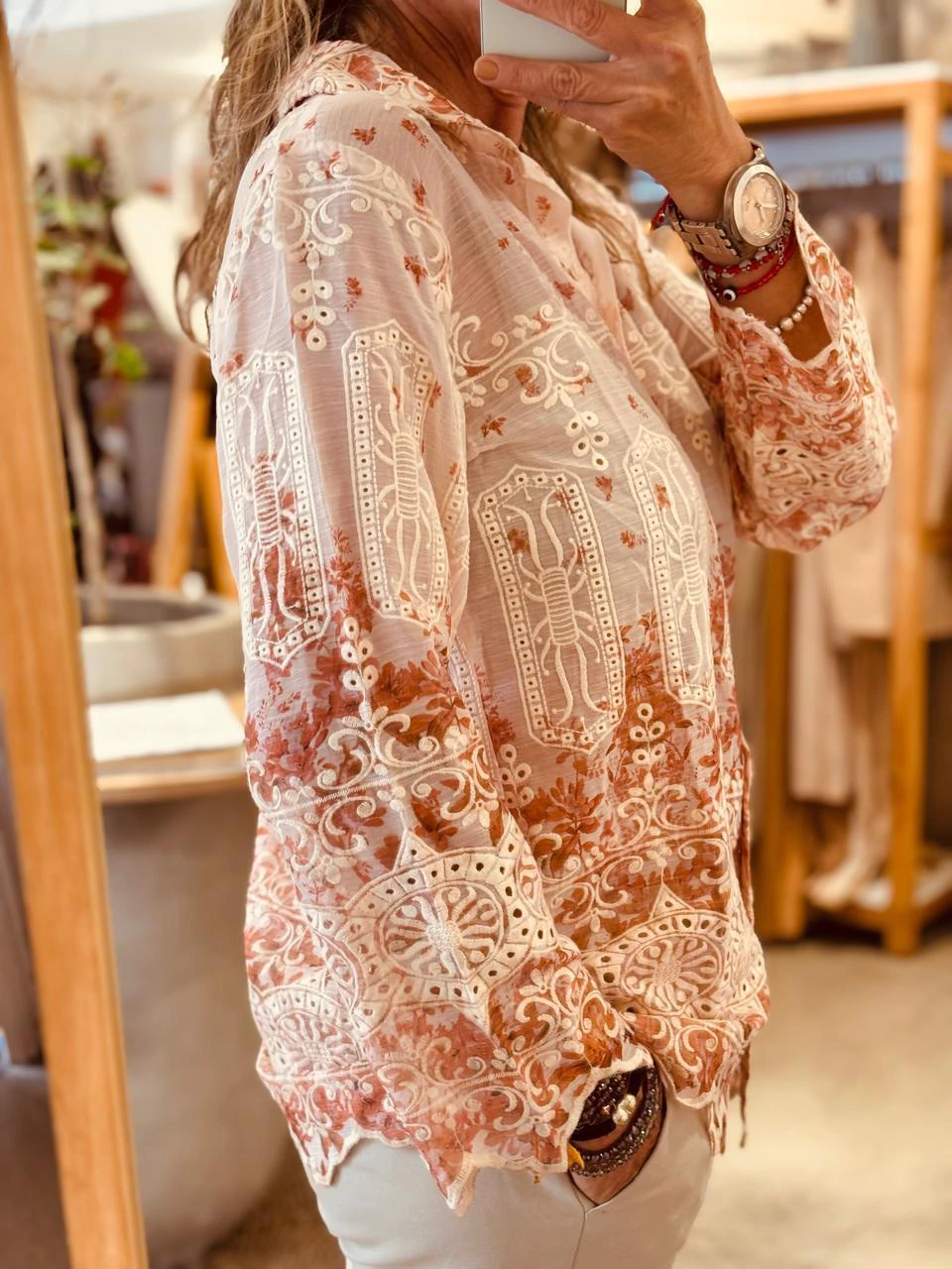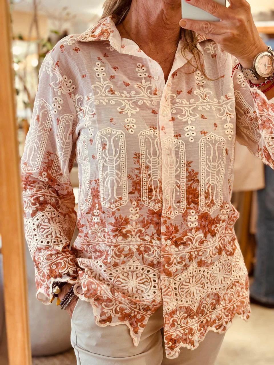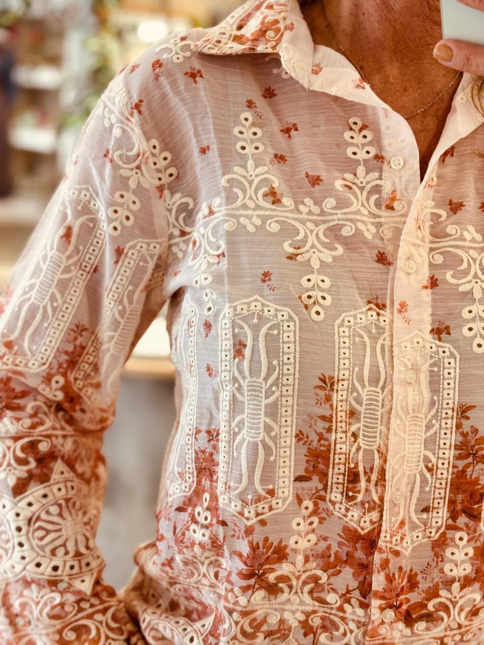 Camisa importada de la india, bordada con detalles en verde y crudo.