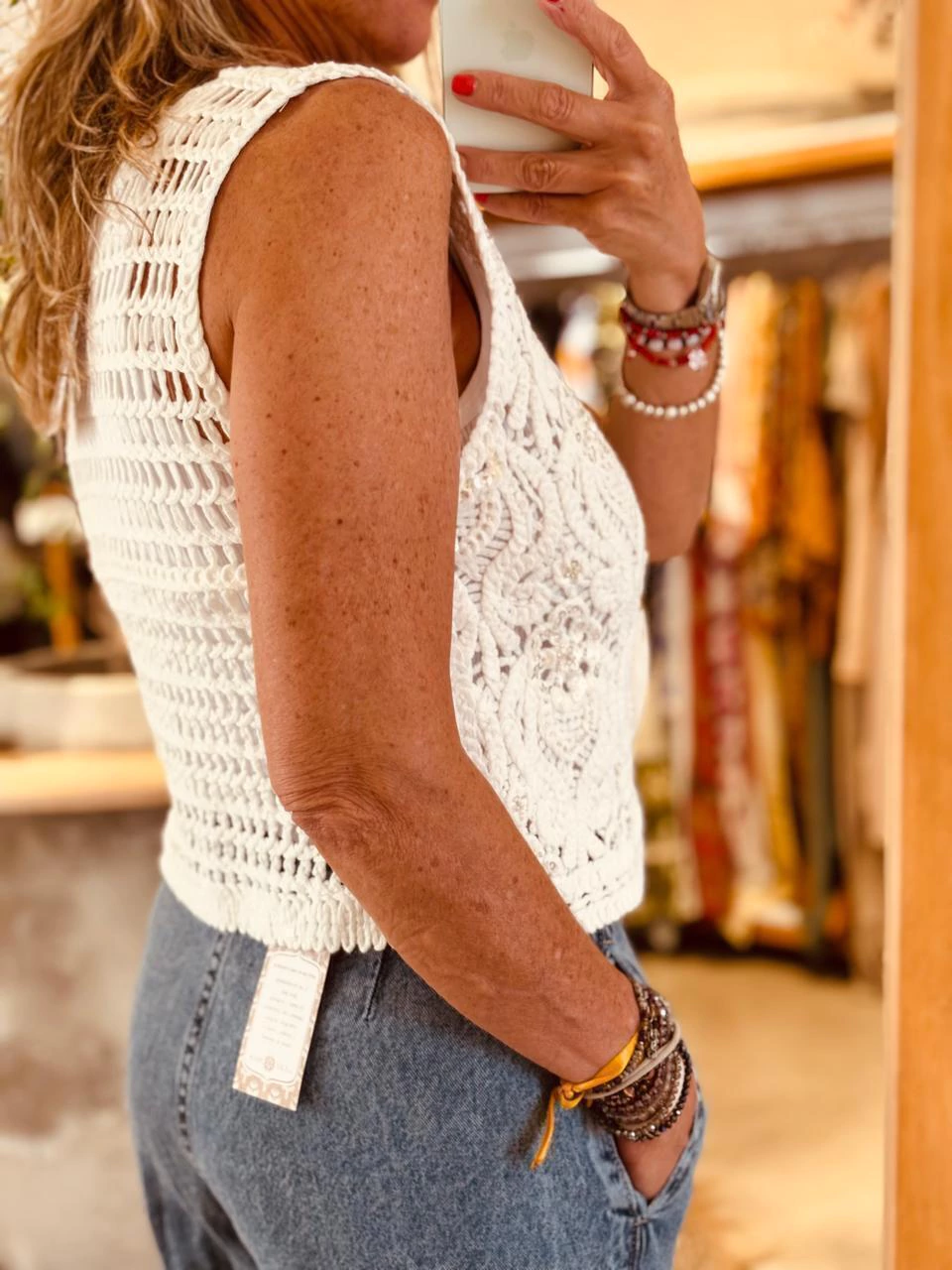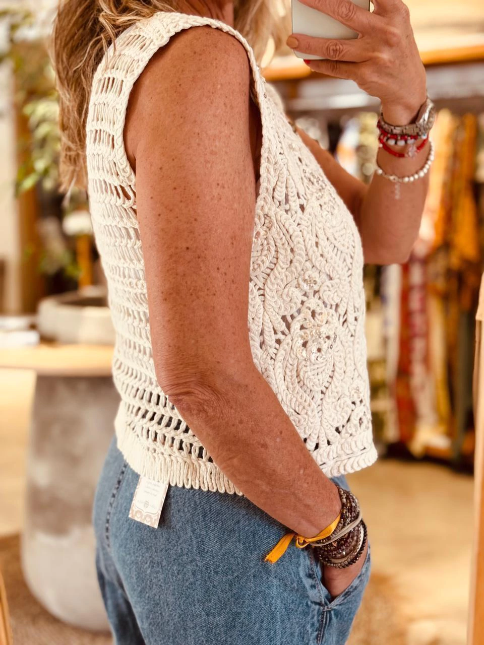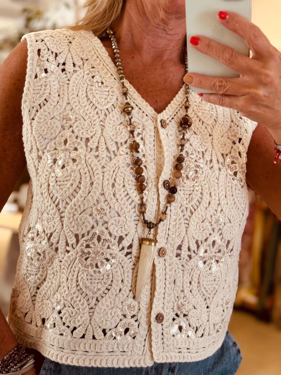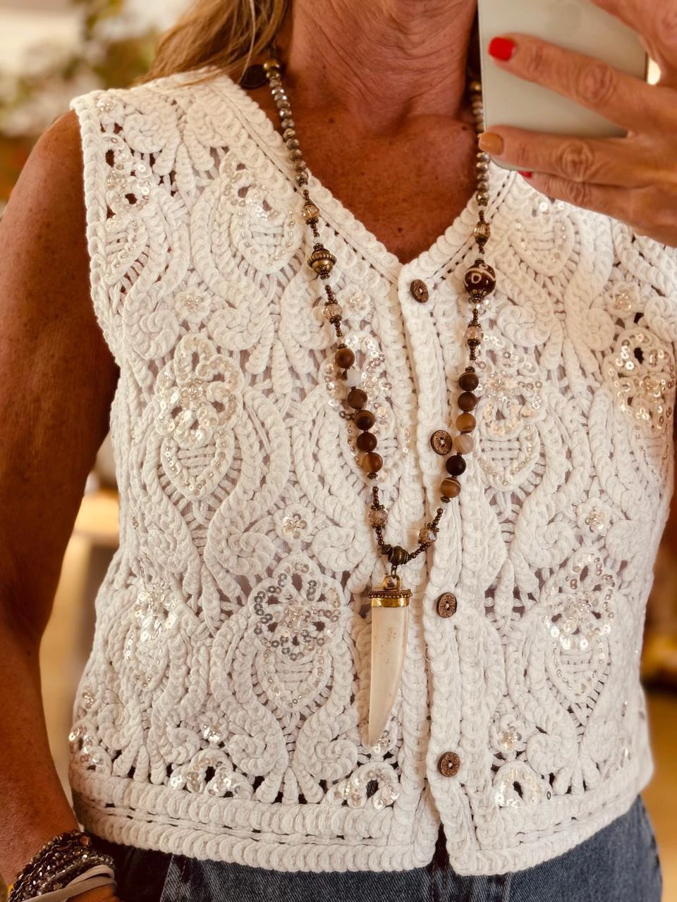 Chaleco tejido con bordado de lentejuelas y canutillos.