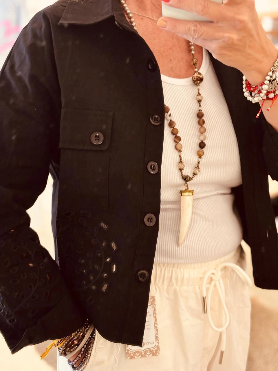 Chaqueta con bolsillos delanteros y calados en diseño de hojitas que forman círculos.