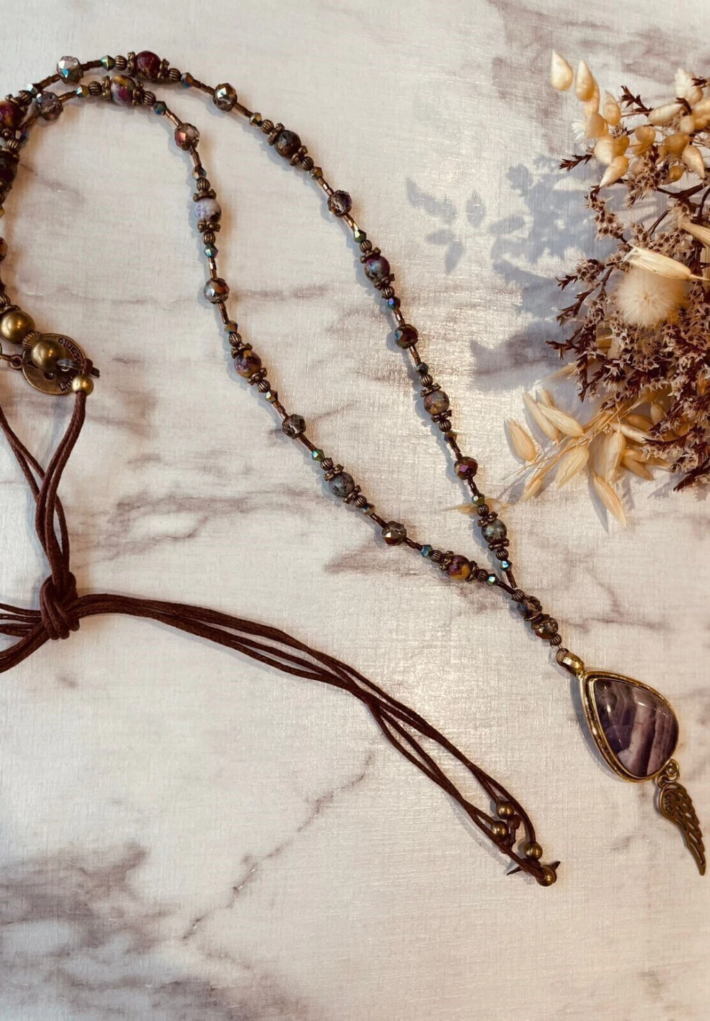 Collar de piedras y cristales con dije en color lila y ala colgando.