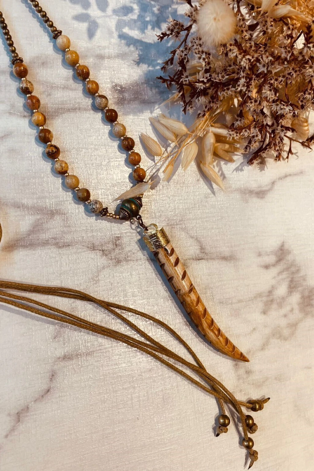 Collar de piedras y cristales con dije de cuerno trabajado con hojitas.