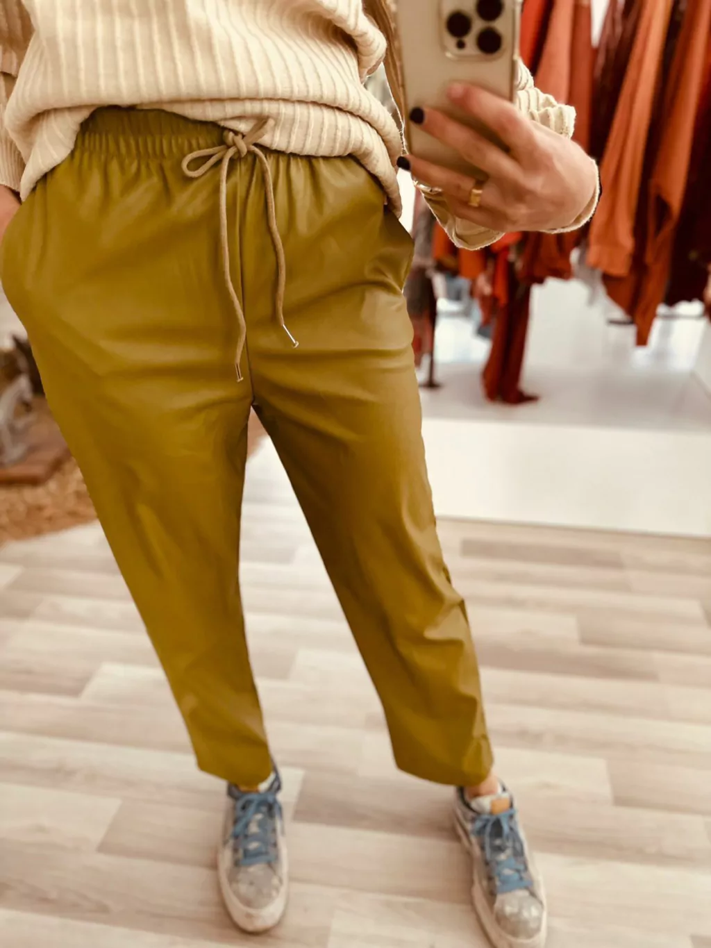 Pantalón babucha con elastico en la cintura de eco cuero.