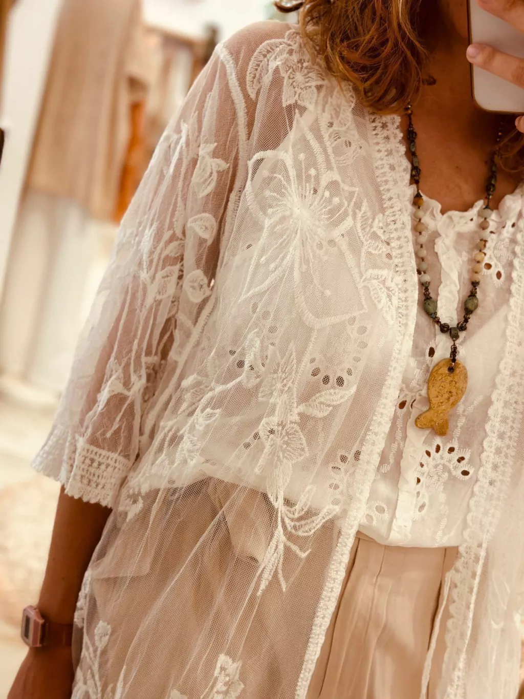 Kimono de hilo tejido y bordado, con delicado diseño floral.