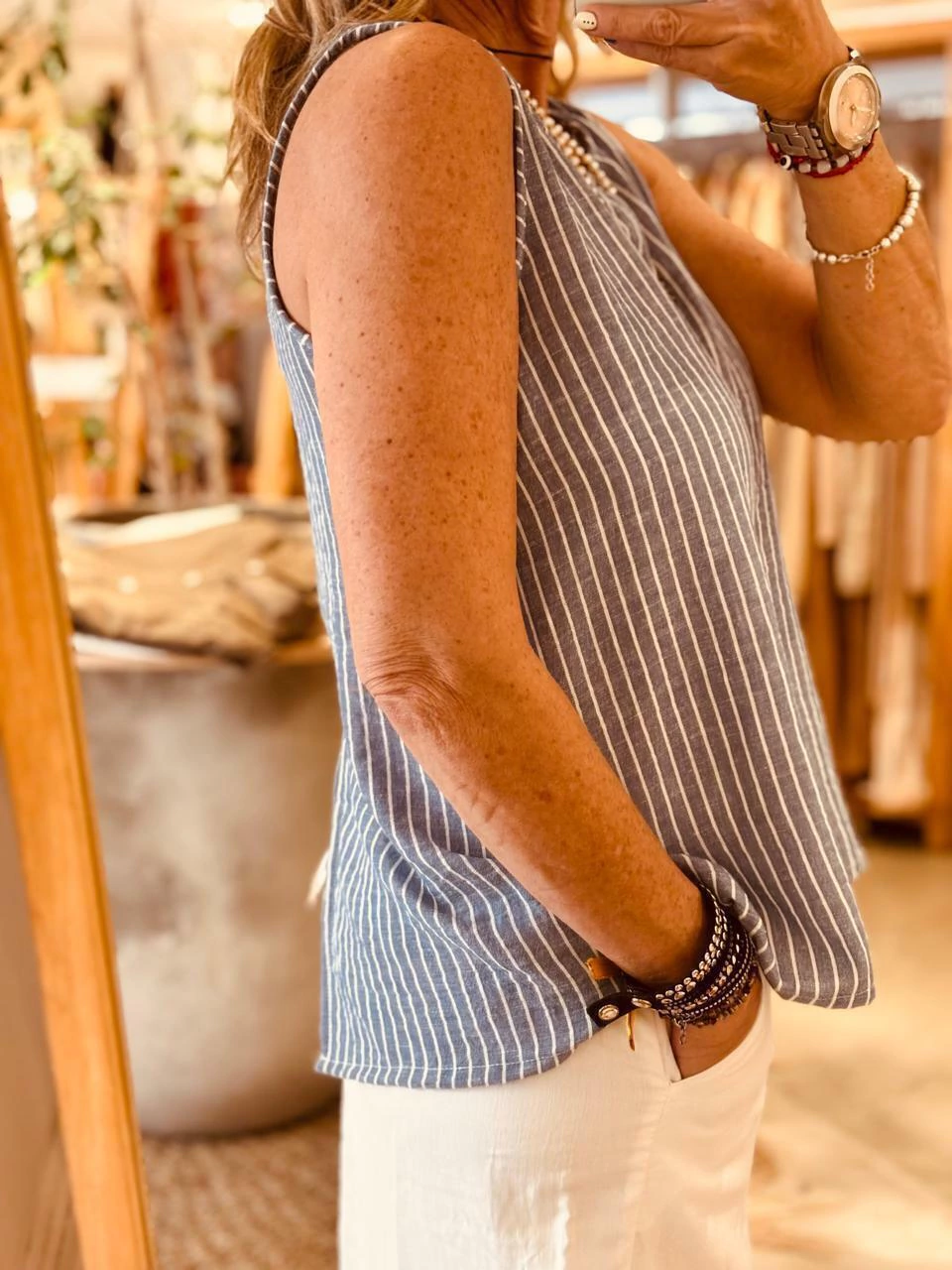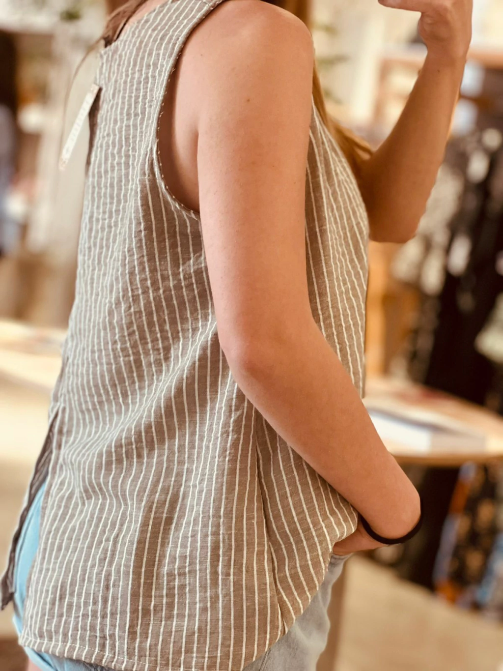 Musculosa tela finita con diseño de rayas y corte en parte trasera.