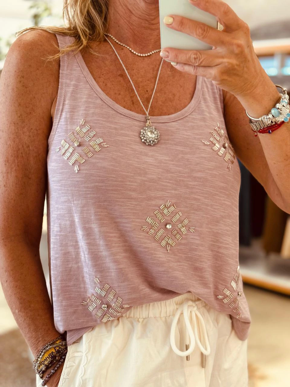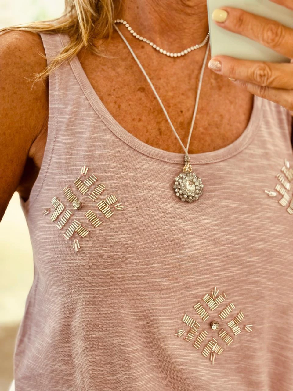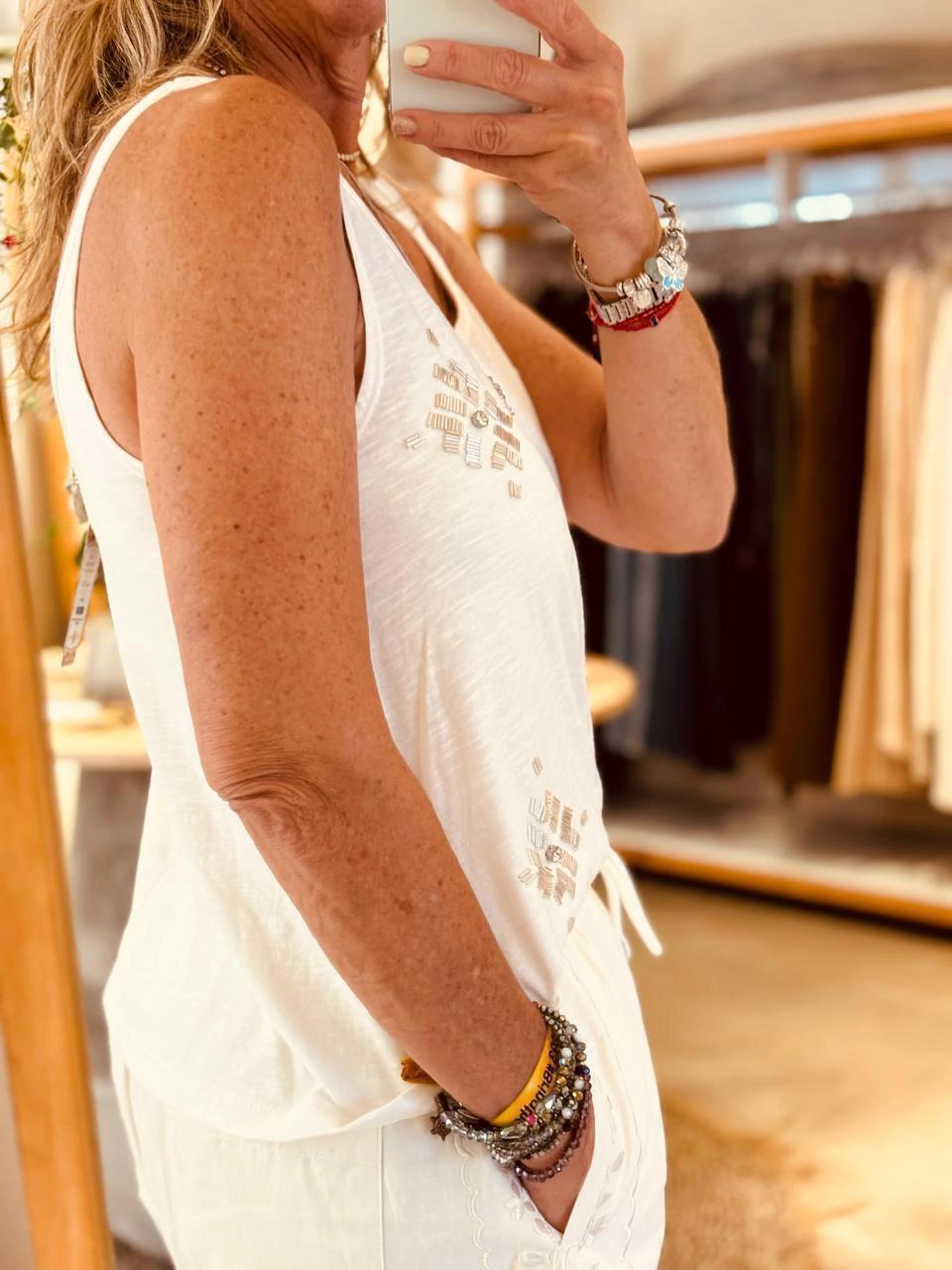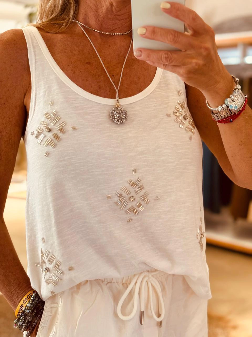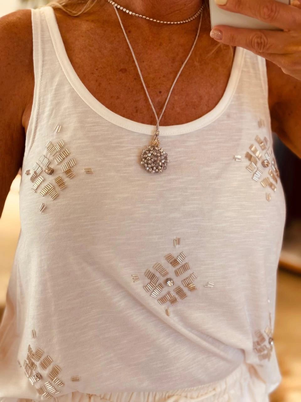 Musculosa de algodón con canutillos bordados, diseño de flores.