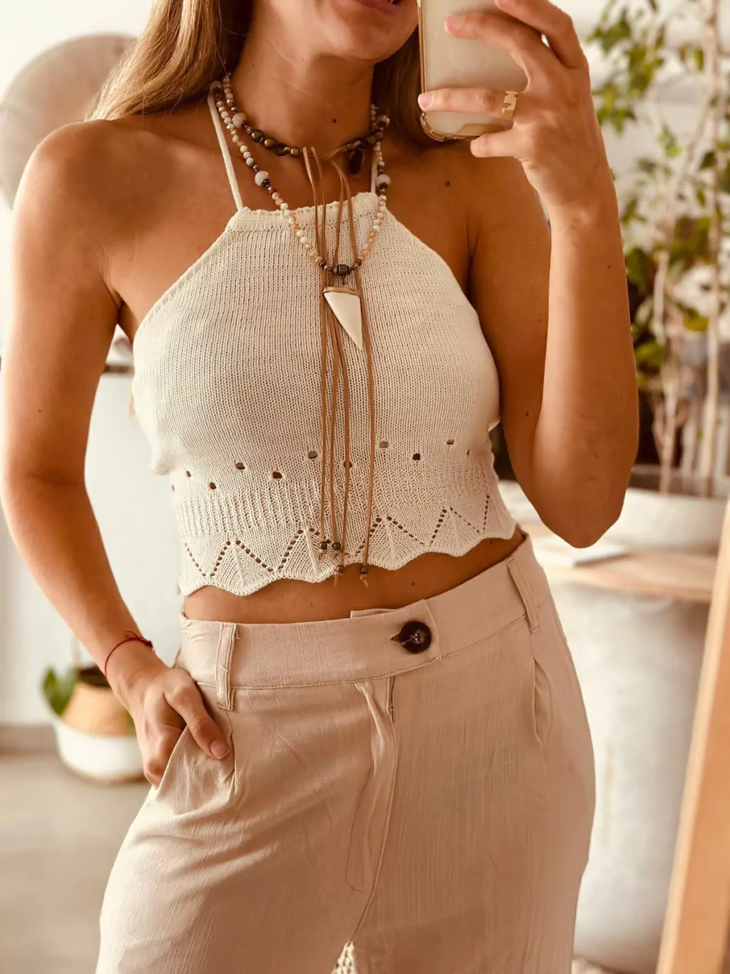 Musculosa tejida en tono crudo. Espalda descubierta con tiritas que se cruzan.