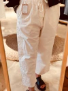Pantalón con elástico en la cintura, bordados en los costados, diseño de flores con hilo a tono. Bolsillos a los costados.