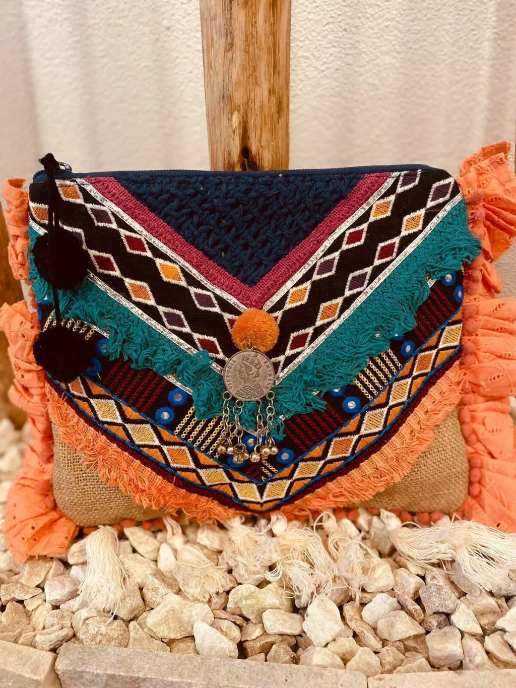 Sobre trabajado bordados en tonos turquesa, coral, azules y muchos mas. Con pompon y modenda en el centro.