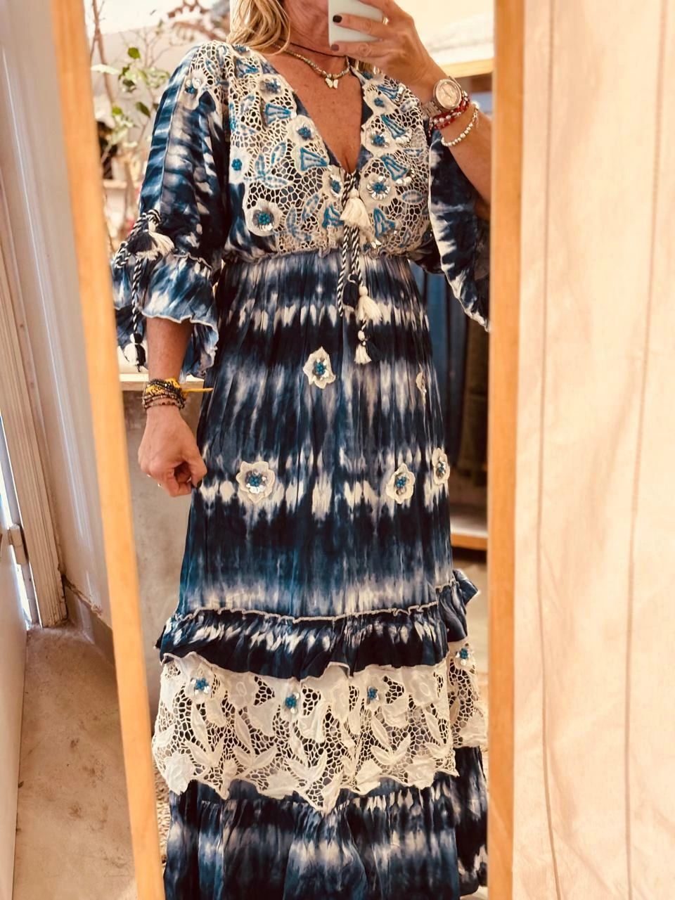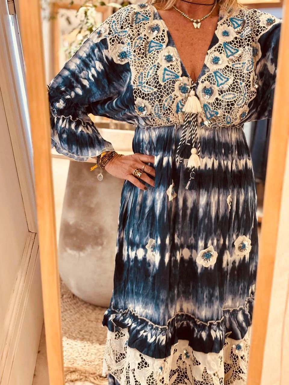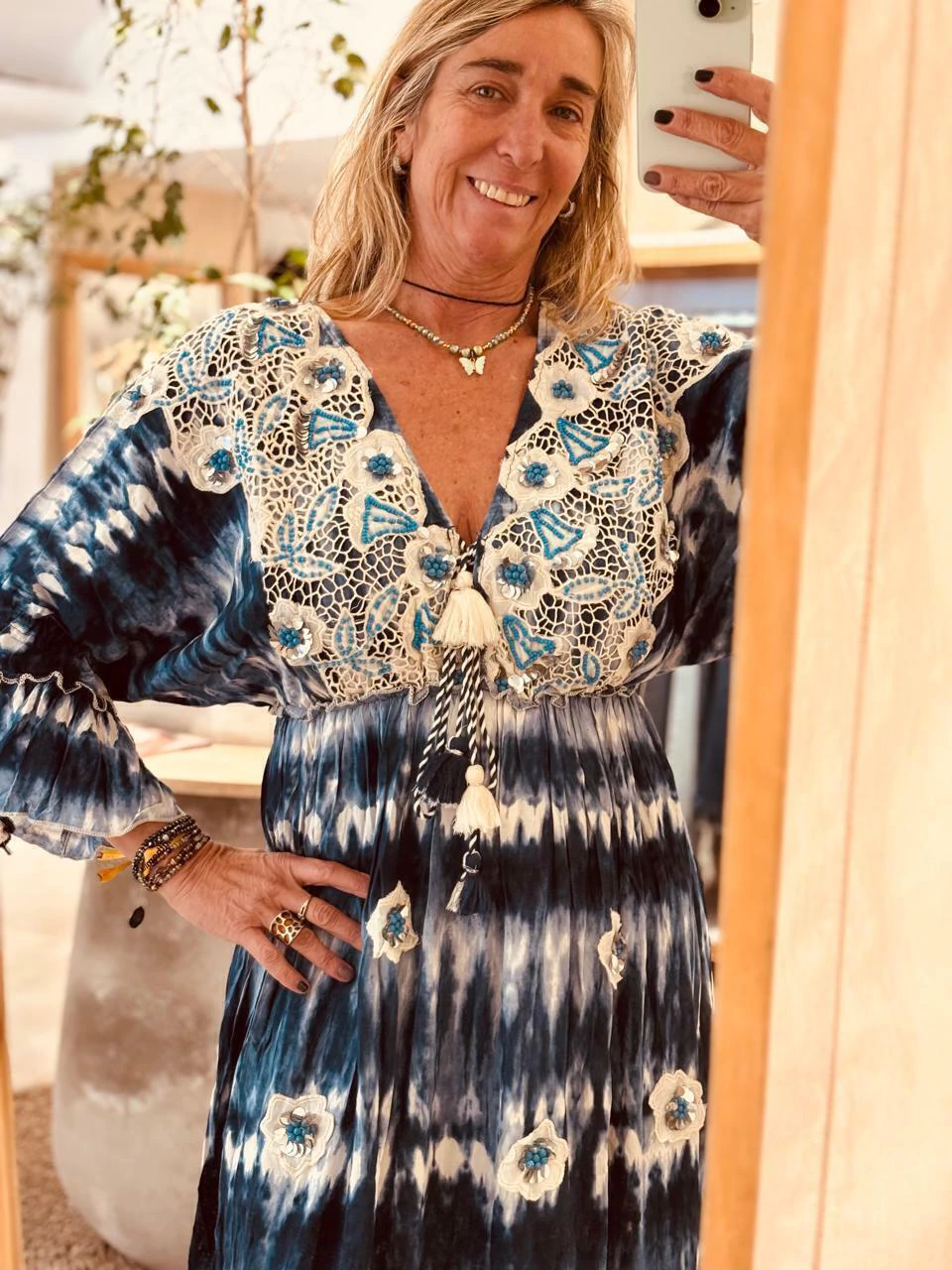 Vestido largo azul batik con bordados de canutillos, piedras y letejuelas.