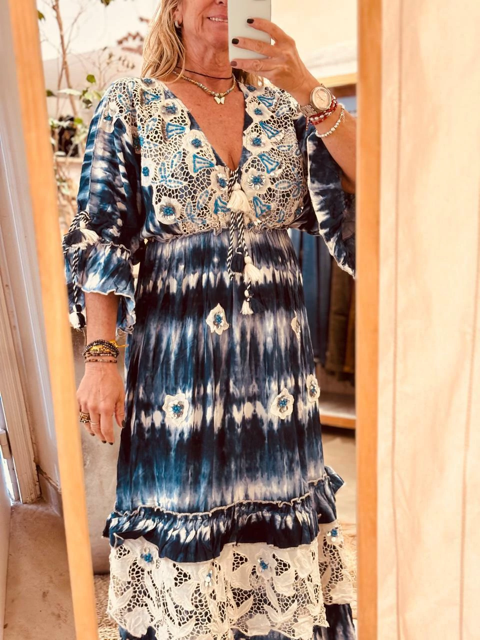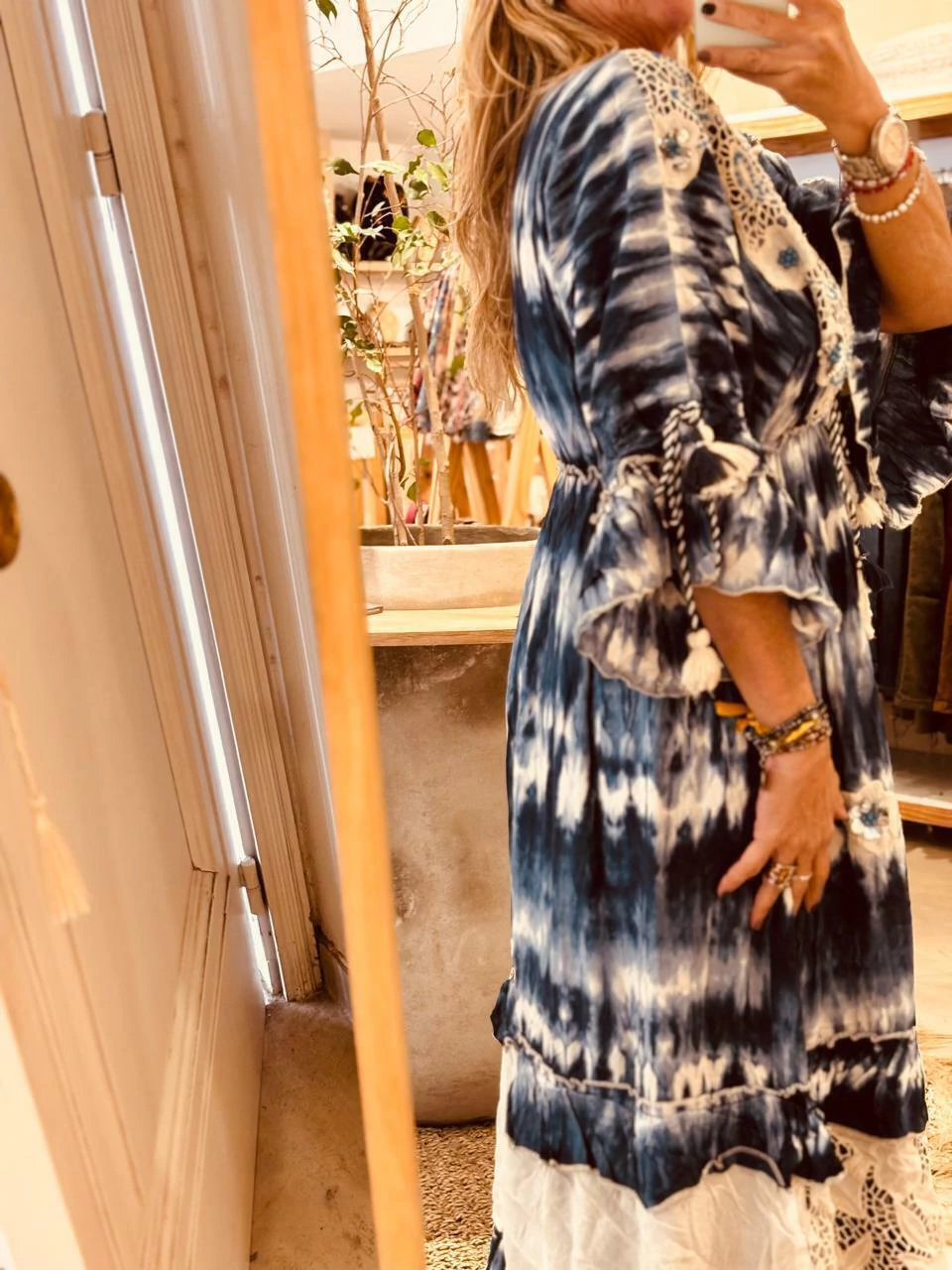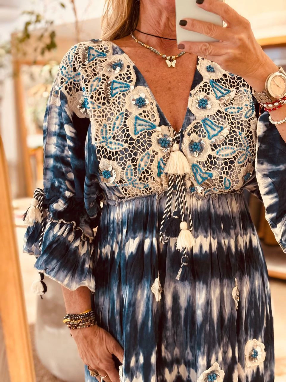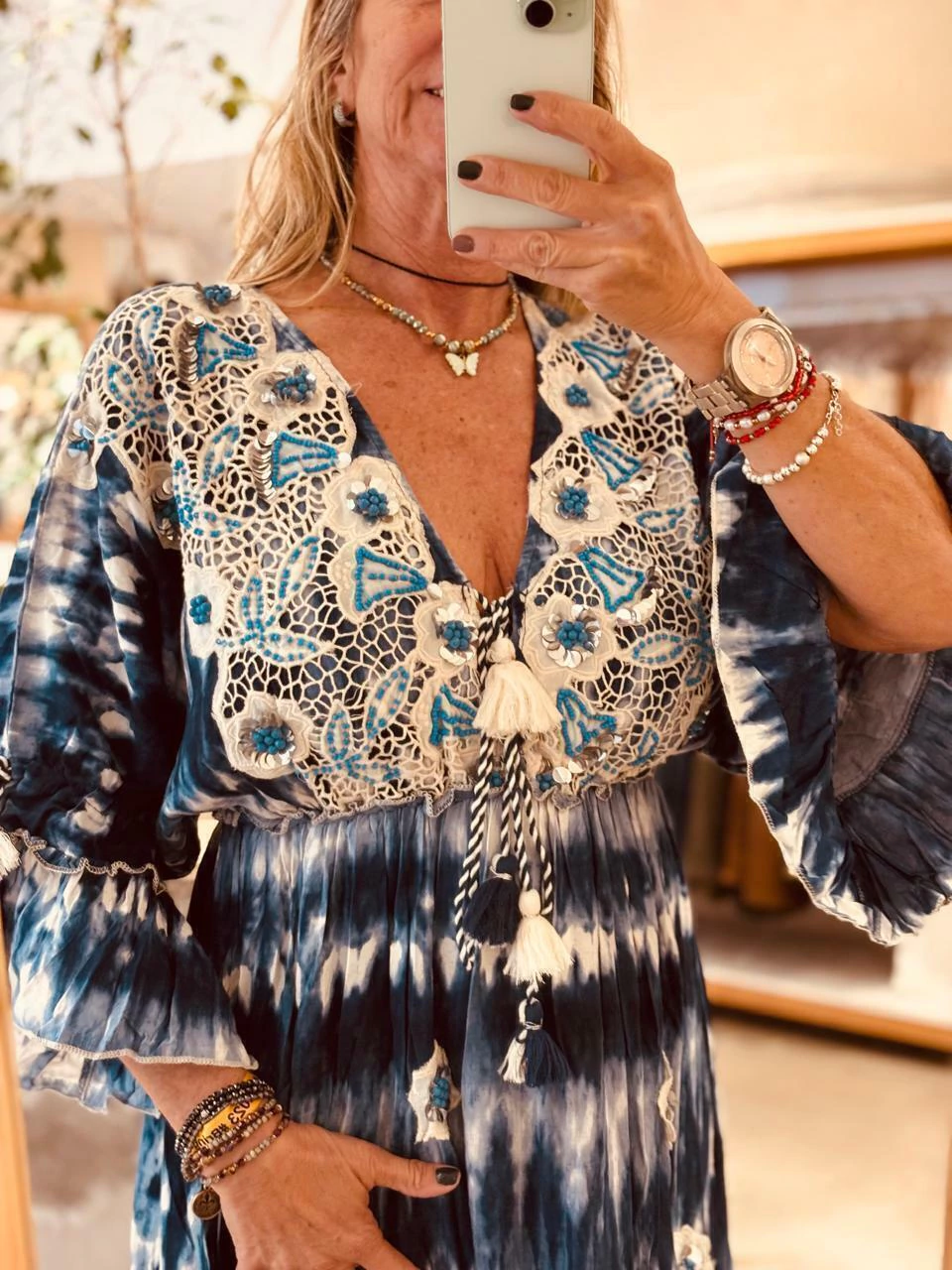 Vestido largo azul batik con bordados de canutillos, piedras y letejuelas.