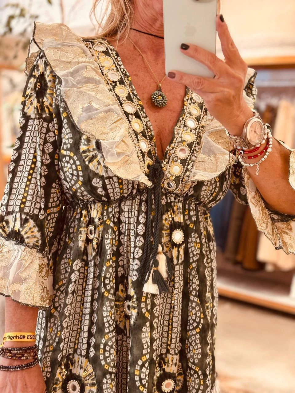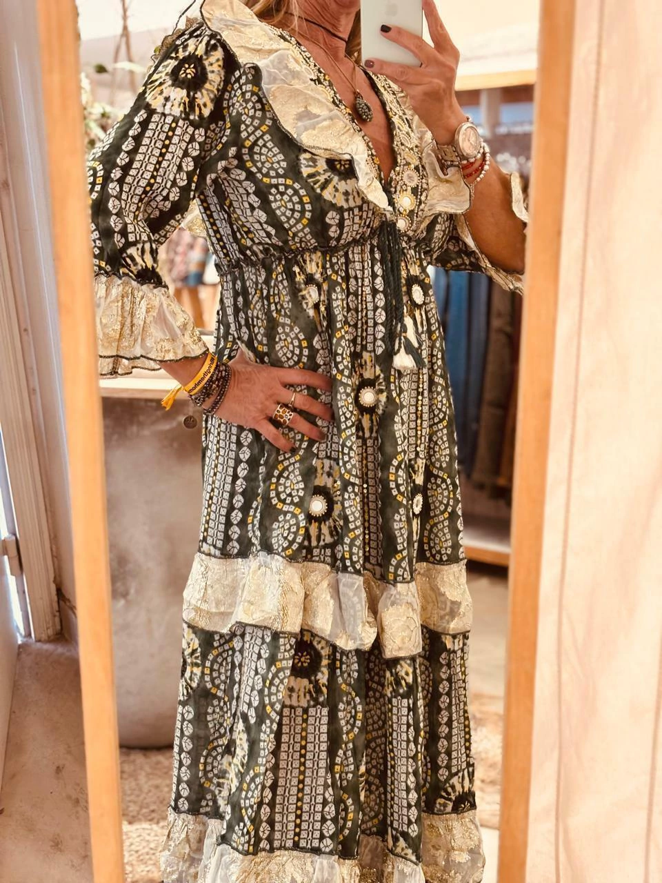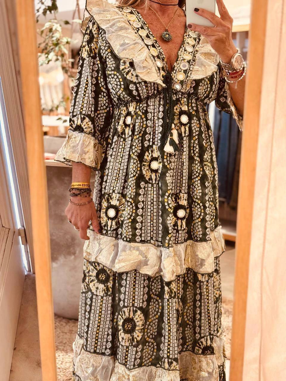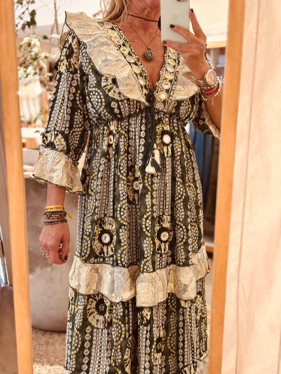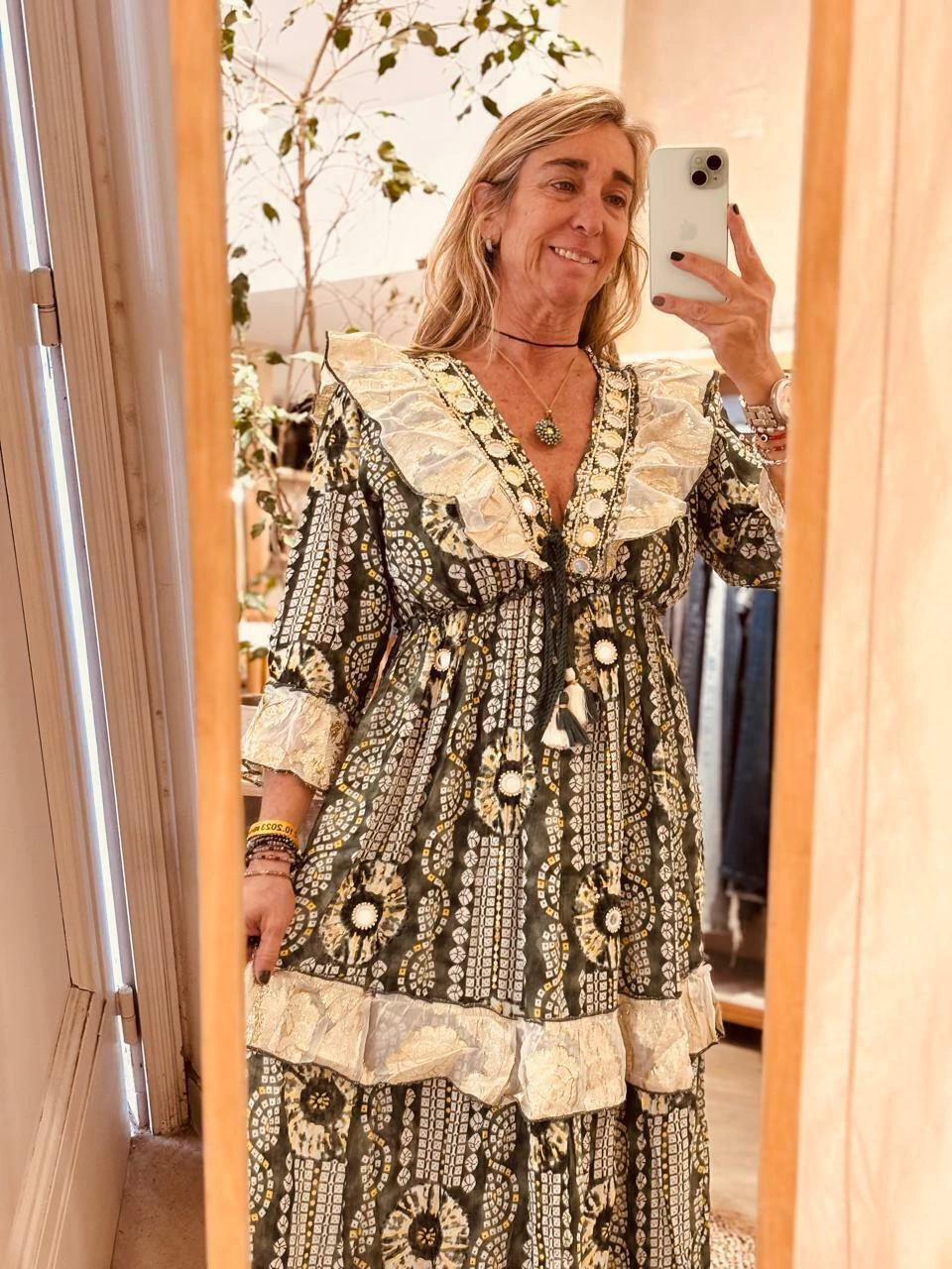 Vestido largo verde con volados en color natural con espejitos redondos.
