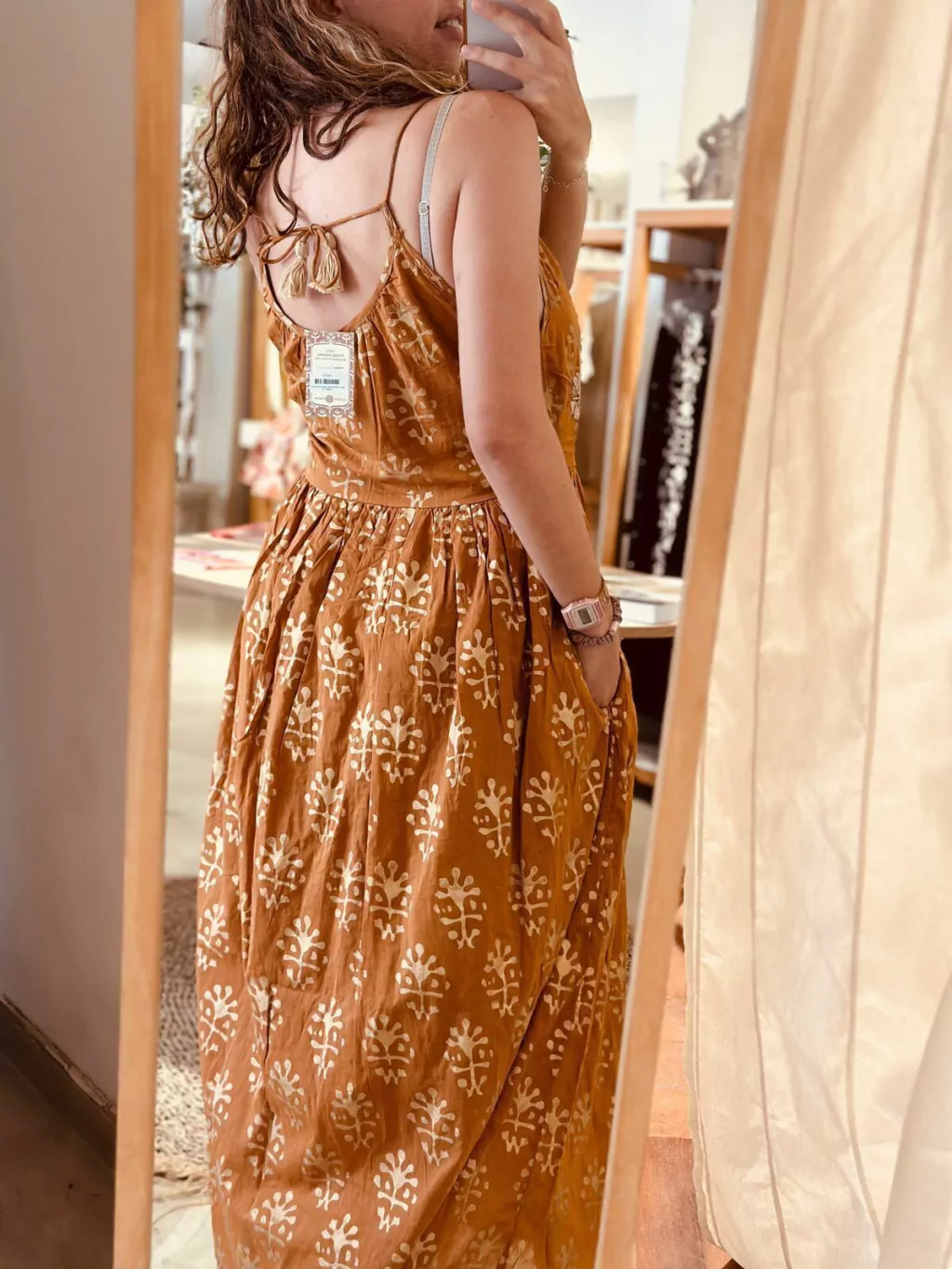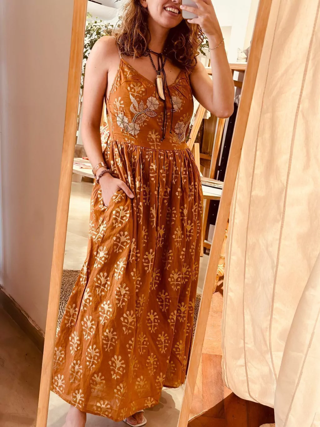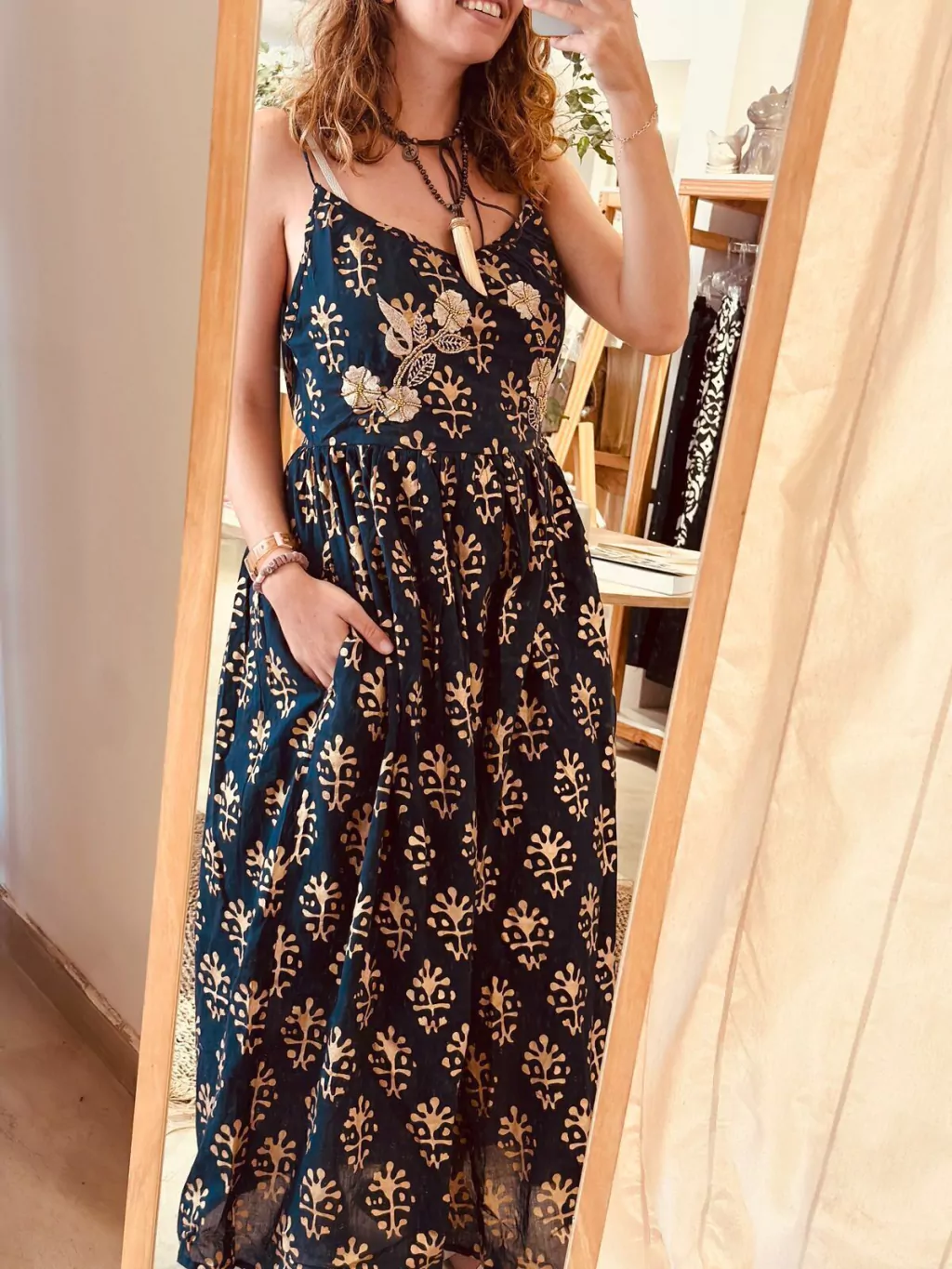 Vestido en dos colores largo, estampado, sin mangas, con canutillos y bolsillos.