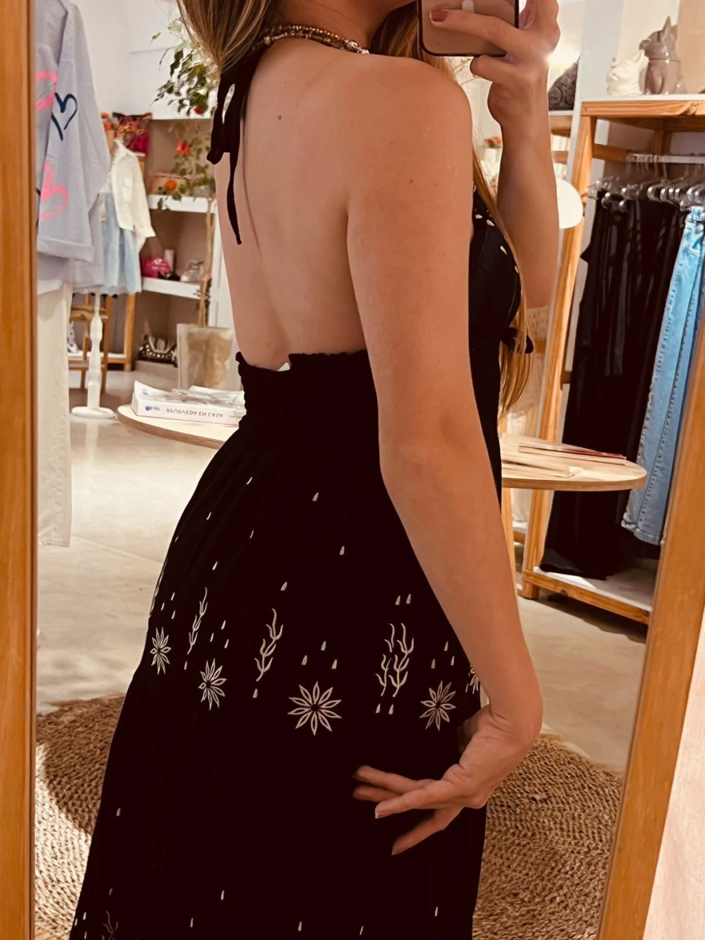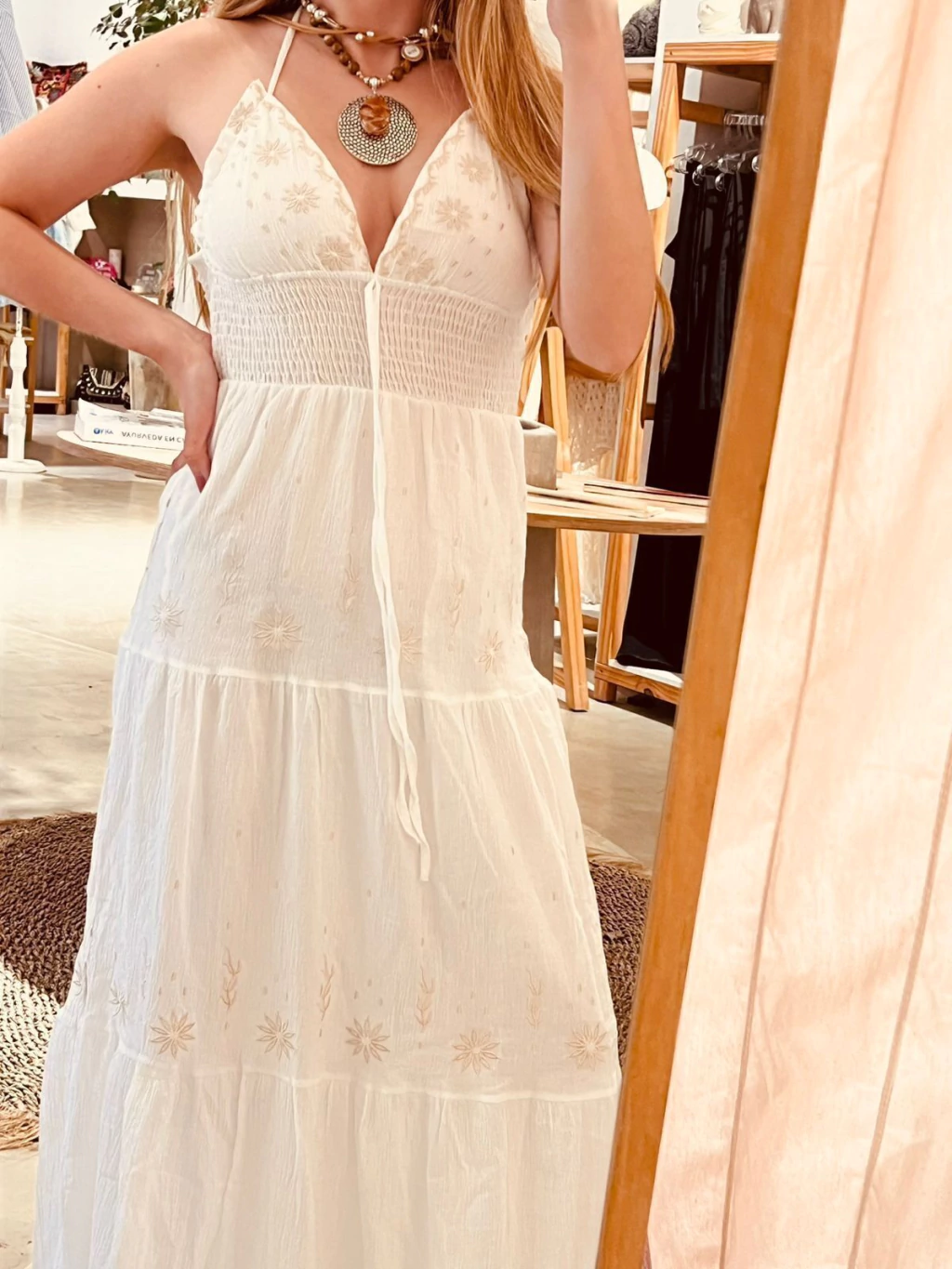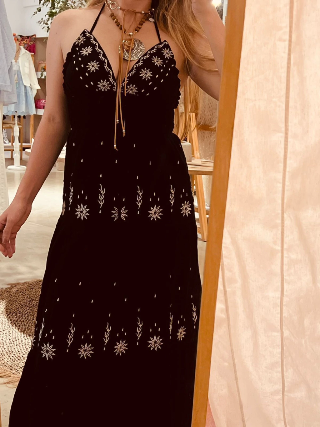 Vestido largo, tira para atar en el cuello. Con bordados de hilo en color beige diseño de flores.