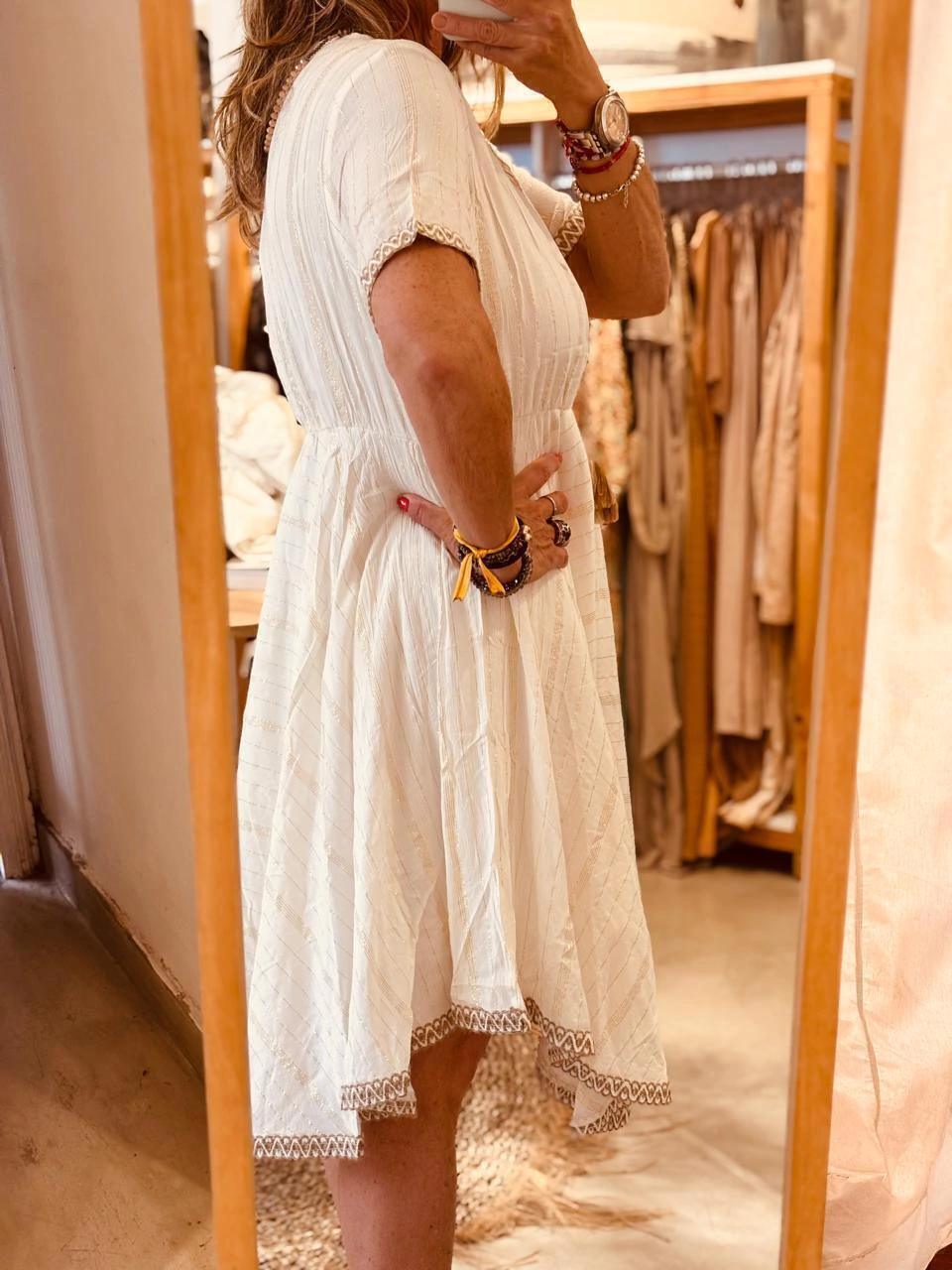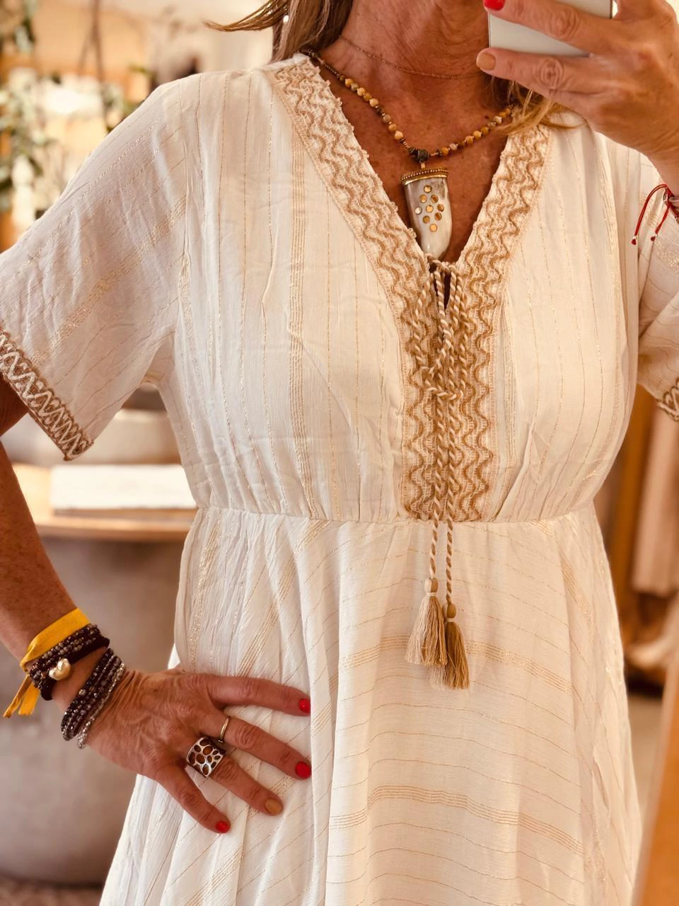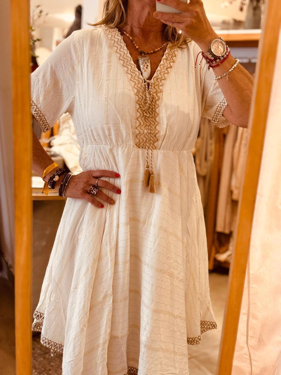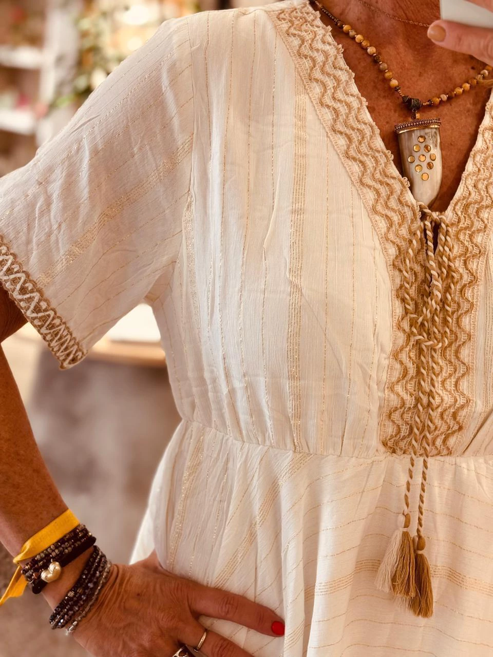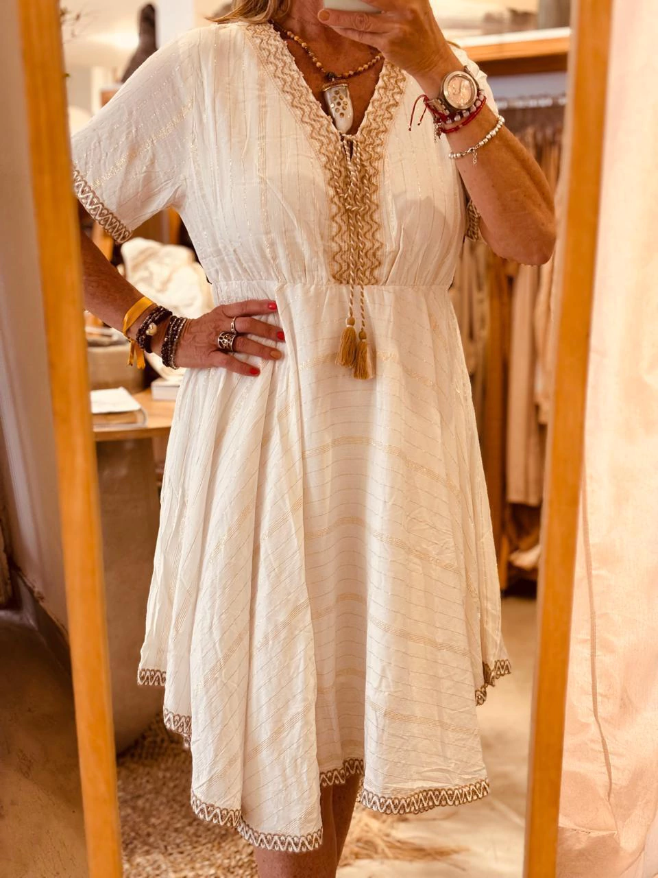 Vestido corto en color balnco, manga corta y escote en V. Bordado beige en mangas y escote, con cordón para atar y detalles en lurex dorado.