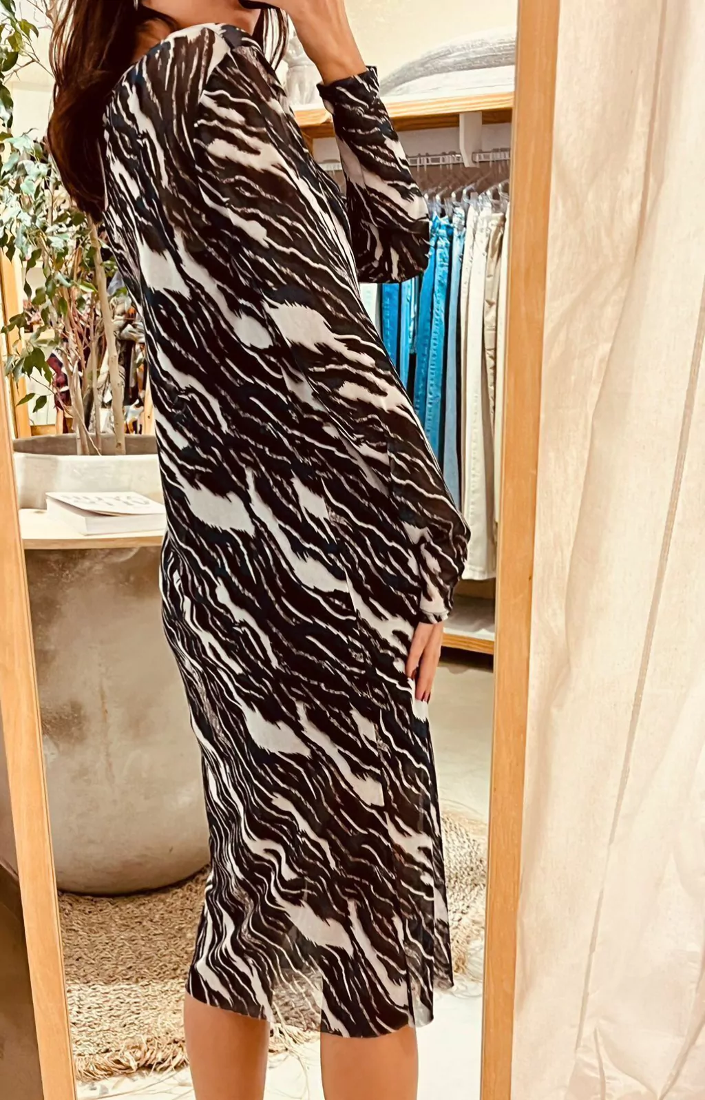 Vestido tul estampa de zebra en tonos azules y negro. Forro negro.